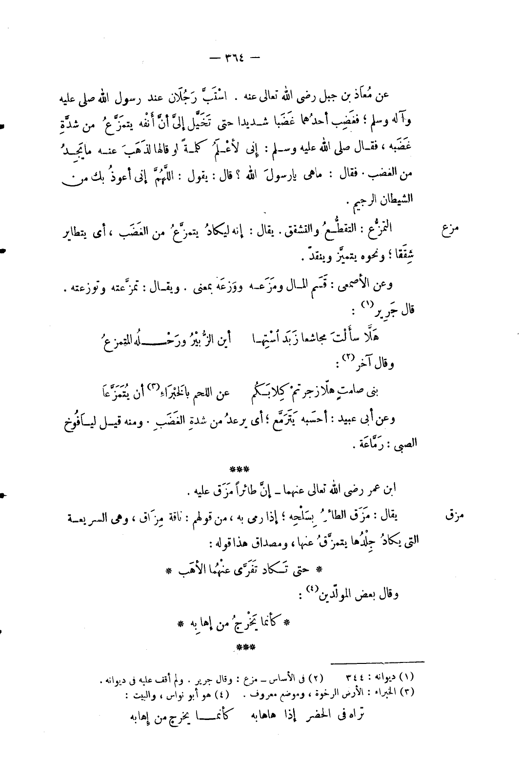 مزع عَن معَاذ بن جبل رَضِي الله تَعَالَى عَنهُ. استبَّ رجلَانِ عِنْد رَسُول الله صلى الله عَلَيْهِ وَسلم فَغَضب أَحدهمَا غَضبا شَدِيدا حَتَّى تخيل إِلَيّ أَن أَنفه يتمزع من شدَّة غَضَبه فَقَالَ صلى الله عَلَيْهِ وَسلم: إِنِّي لأعْلم كلمة لَو قَالَهَا لذهب عَنهُ مَا يجد من الْغَضَب. فَقَالَ: مَا هِيَ يَا رَسُول الله قَالَ: يَقُول: اللَّهُمَّ إِنِّي أعوذ بك من الشَّيْطَان الرَّجِيم. التمزُّع: التقطُّع والتشقق. يُقَال: إِنَّه ليكاد يتمزَّع من الْغَضَب أَي يتطاير شققا وَنَحْوه يتَمَيَّز وينقدّ. وَعَن الْأَصْمَعِي: قسم المَال ومزعه ووزعه بِمَعْنى. وَيُقَال: تمزَّعته وتوزعته. قَالَ جرير: ... هَلا سأَلْتَ مجاشعا زَبَد اُسْتِها ... أَيْن الزُّبْيُر ورَحْلُه المتمزعُ ... وَقَالَ آخر: ... بني صامتٍ هلاّ زجرتمْ كِلابَكُم ... عَن اللَّحْم بالخَبْرَاءِ أَن يُتَمَزَّعَا ... وَعَن أبي عبيد: احسبه يترمَّع أَي يرعد من شدَّة الْغَضَب. وَمِنْه قيل ليافوخ الصَّبِي: رماعة.