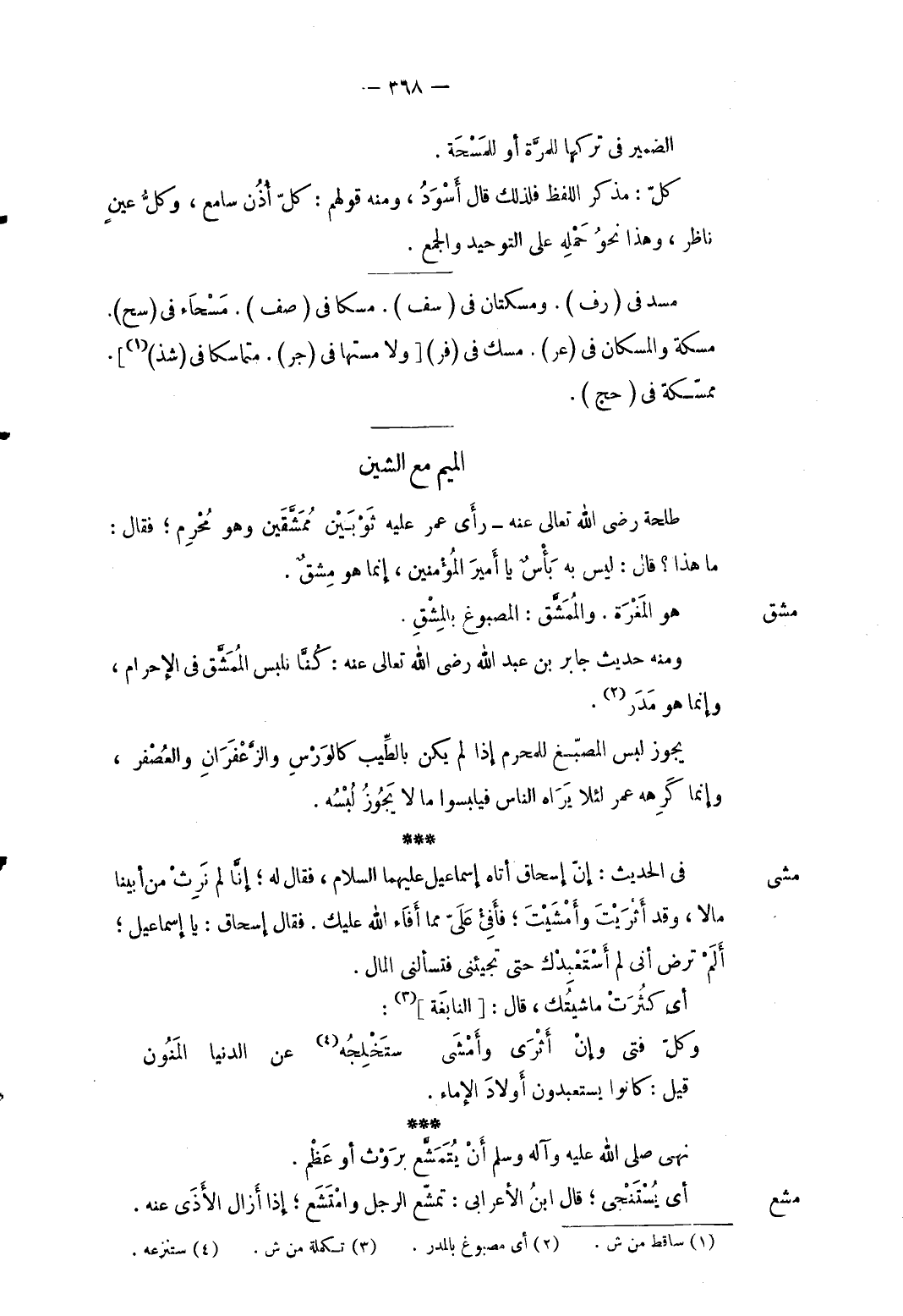 مشق طَلْحَة رَضِي الله تَعَالَى عَنهُ رأى عمر عَلَيْهِ ثَوْبَيْنِ ممشَّقين وَهُوَ محرم فَقَالَ: مَا هَذَا قَالَ: لَيْسَ بِهِ بَأْس يَا أَمِير الْمُؤمنِينَ إِنَّمَا هُوَ مشقٌ. هُوَ الْمغرَة. والممشق: الْمَصْبُوغ بالمشق. وَمِنْه حَدِيث جَابر بن عبد الله رَضِي الله تَعَالَى عَنهُ: كُنَّا نلبس الممشق فِي الْإِحْرَام وَإِنَّمَا هُوَ مدر. يجوز لبس المصبغ للْمحرمِ إِذا لم يكن بالطِّيب كالورس والزعفران والعصفر وَإِنَّمَا كرهه عمر لِئَلَّا يرَاهُ النَّاس فيلبسوا مَا لَا يجوز لبسه.