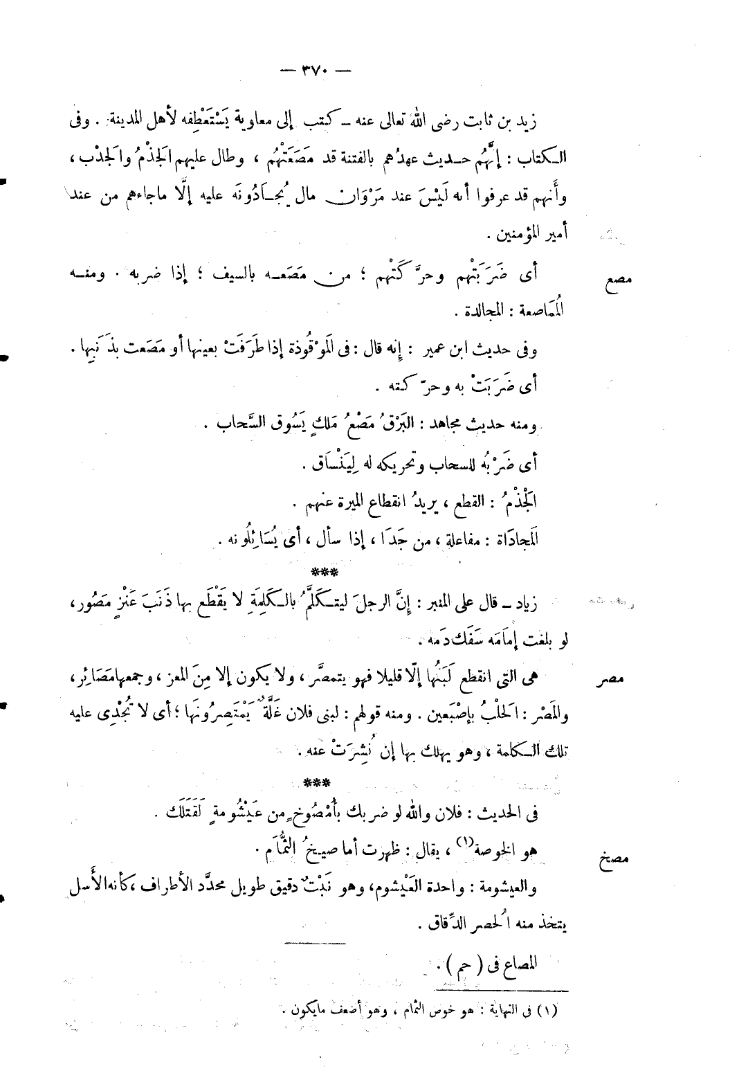 مصع زيد بن ثَابت رَضِي الله تَعَالَى عَنهُ كتب إِلَى مُعَاوِيَة يستعطفه لأهل الْمَدِينَة وَفِي الْكتاب: إِنَّهُم حَدِيث عَهدهم بالفتنة قد مصعتهم وَطَالَ عَلَيْهِم الجذم والجدب وَأَنَّهُمْ قد عرفُوا أَنه لَيْسَ عِنْد مَرْوَان مَال يجادونه عَلَيْهِ إِلَّا مَا جَاءَهُم من عِنْد أَمِير الْمُؤمنِينَ. أَي ضربتهم وحركتهم من مصعه بِالسَّيْفِ إِذا ضربه. وَمِنْه المماصعة: المجالدة. وَفِي حَدِيث ابْن عُمَيْر: إِنَّه قَالَ: فِي الموقوذة إِذا طرفت بِعَينهَا أَو مصعت بذنبها. أَي ضربت بِهِ وحركته. وَمِنْه حَدِيث مُجَاهِد: الْبَرْق مصع ملك يَسُوق السَّحاب. أَي ضربه للسحاب وتحريكه لَهُ لينساق. الجذم: الْقطع يُرِيد انْقِطَاع الْميرَة عَنْهُم. المجاداة: مفاعلة من جدا إِذا سَأَلَ أَي يسائلونه.