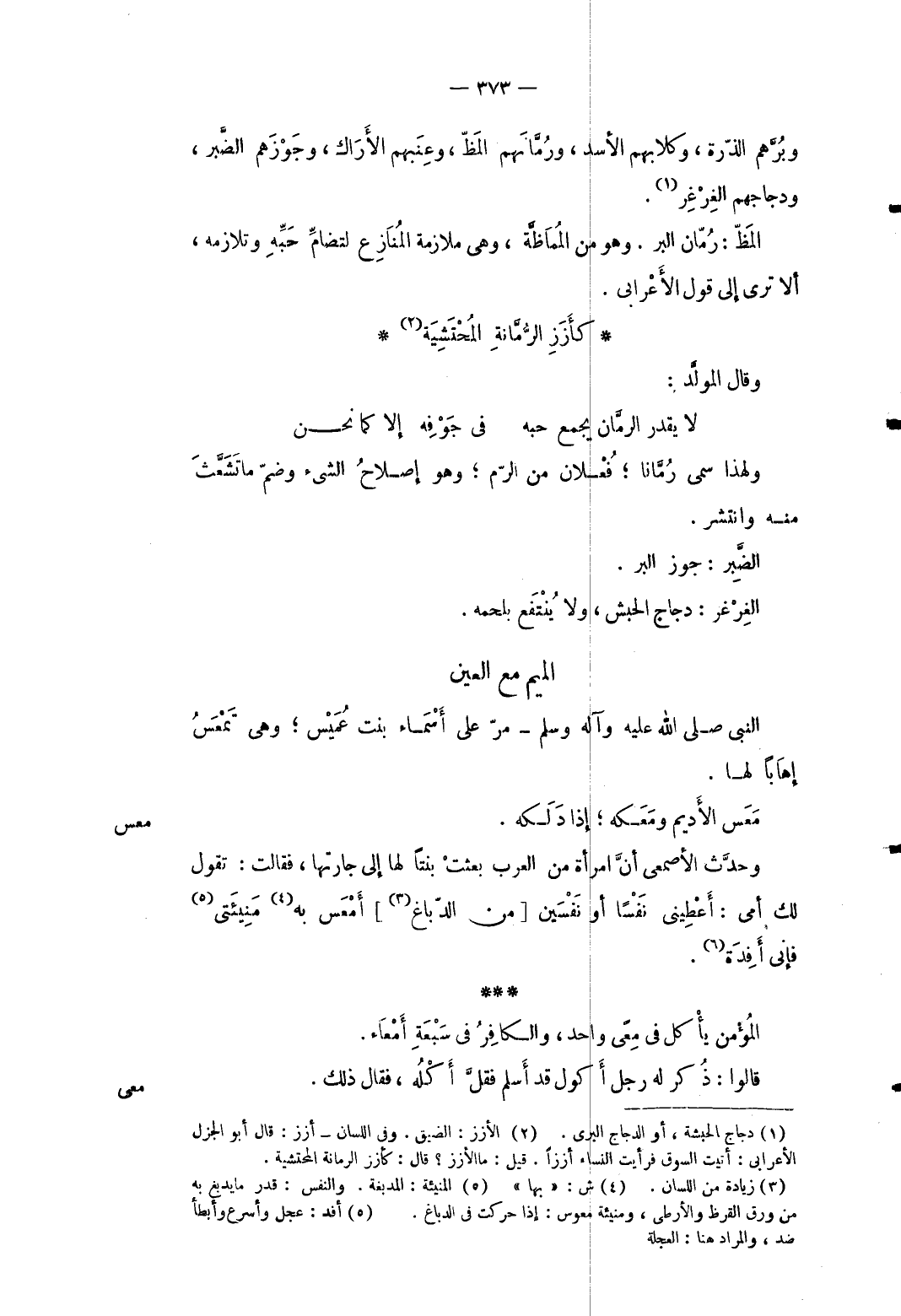 وبرَّهم الذّرة وكلابهم الْأسد ورمَّانهم المظّ وعنبهم الْأَرَاك وجوزهم الضَّبر ودجاجهم الغرغر. المظّ: رمان الْبر. وَهُوَ من المماظَّة وَهِي مُلَازمَة المنازع لتضامِّ حبِّه وتلازمه أَلا ترى إِلَى قَول الْأَعرَابِي. ... كأزر الرمانة المحتشية ... وقالو المولَّد: ... لَا يقدر الرمَّان يجمع حبه ... فِي جَوْفِه إِلَّا كَمَا نَحن ... وَلِهَذَا سمي رمانا فعلان من الرّم وَهُوَ إصْلَاح الشَّيْء وضمّ مَا تشَّعثَ مِنْهُ وانتشر. الضَّبر: جوز الْبر. الغرغر: دَجَاج الْحَبَش وَلَا ينْتَفع بِلَحْمِهِ.