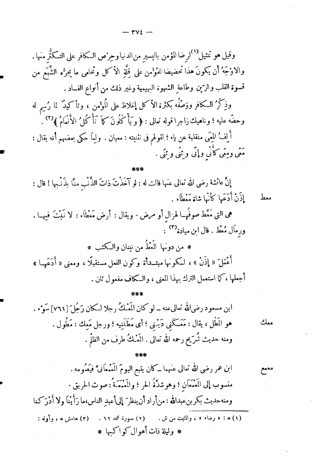 وَقيل هُوَ تَمْثِيل لرضا الْمُؤمن باليسير من الدُّنْيَا وحرص الْكَافِر على التكثر مِنْهَا. والاوجه أَن يكون هَذَا تحضيضا لِلْمُؤمنِ على قلَّة الْأكل وتحامي مَا يجرُّه الشِّبَع من قسوة الْقلب والرّين وَطَاعَة الشَّهْوَة البهيمية وَغير ذَلِك من أَنْوَاع الْفساد. وَذكر الْكَافِر وَوَصفه بِكَثْرَة الْأكل إغلاظ على الْمُؤمن وتأكيد لما رُسم لَهُ وحضّه عَلَيْهِ وناهيك زاجرا قَوْله تَعَالَى: {ويَأْكُلُونَ كَمَا تَأْكُلُ الأَنْعَامُ} . ألف المعي منقلبة عَن يَاء لقَولهم فِي تثنيته: معيان. وَلما حكى بَعضهم أَنه قَالَ: معى ومعى كأنى وإنى وثنى وثنى.
