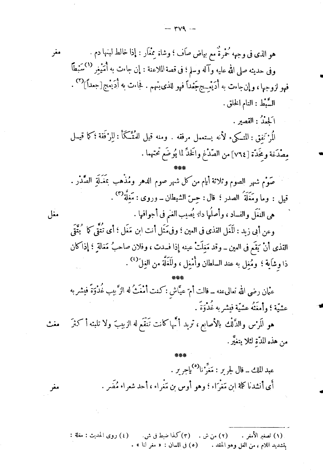 مغر هُوَ الَّذِي فِي وَجهه حمرَة مَعَ بَيَاض صَاف وشَاة ممغار: إِذا خالط لَبنهَا دم. وَفِي حَدِيثه صلى الله عَلَيْهِ وَسلم فِي قصَّة الْمُلَاعنَة: إِن جَاءَت بِهِ أُميغر سبطاً فَهُوَ لزَوجهَا وَإِن جَاءَت بِهِ اديعج جَعدًا فَهُوَ الذى يتهم. فَجَاءَت بِهِ أُديعج جَعدًا. السبط: التَّام الْخلق. الْجَعْد: الْقصير. المرتفق: المتكئ لِأَنَّهُ يسْتَعْمل مرفقه. وَمِنْه قيل للمتكأ: المرفقة كَمَا قيل مصدغة ومخدة من الصدغ والخدِّ لما يُوضع تحتهما.