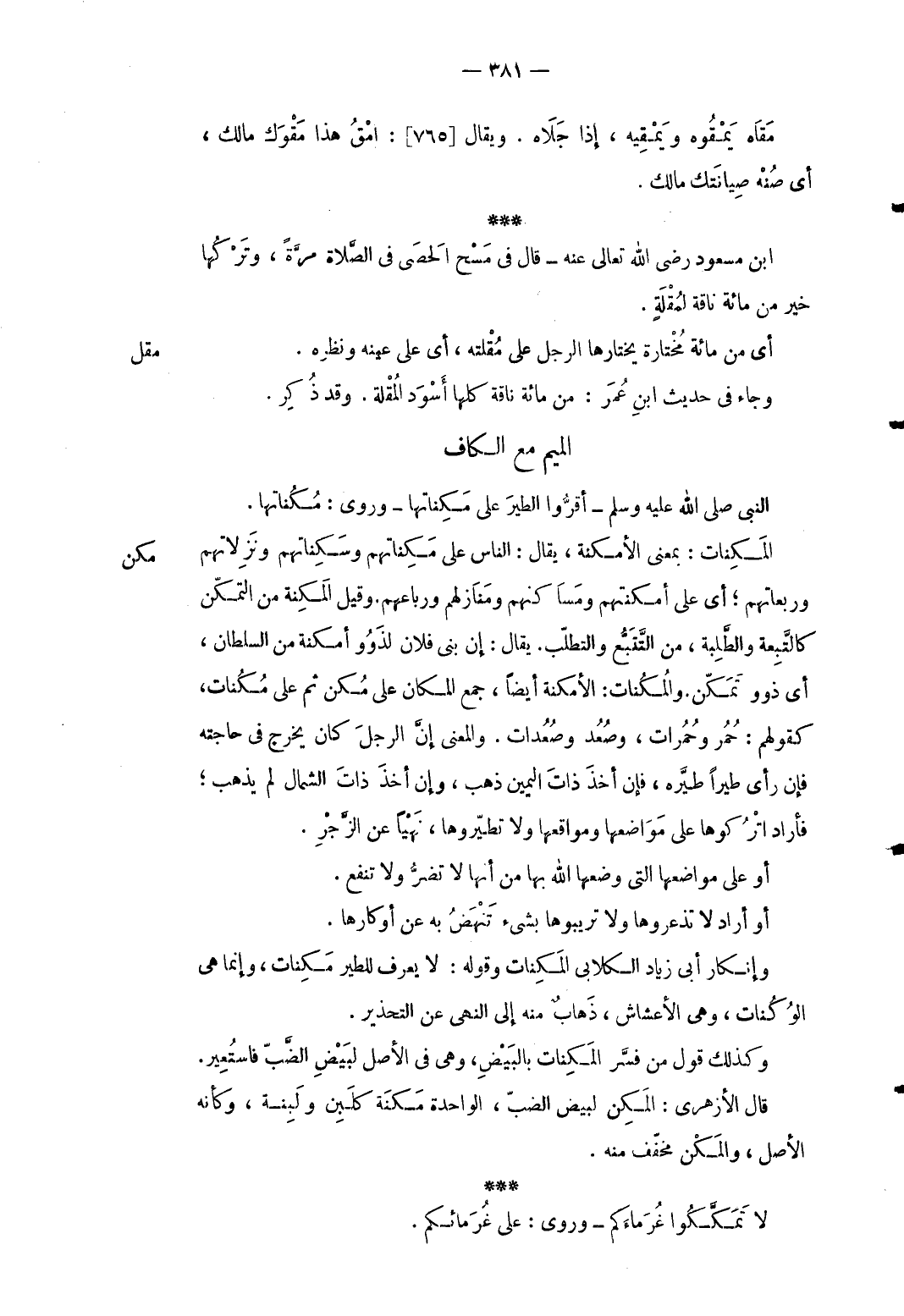 مكن النَّبِي صلى الله عَلَيْهِ وَسلم أقرُّوا الطير على مكناتها وروى: مكناتها. المكنات: بِمَعْنى الْأَمْكِنَة يُقَال: النَّاس على مكناتهم وسكناتهم ونزلاتهم وربعاتهم أَي على أمكنتهم ومساكنهم ومنازلهم ورباعهم. وَقيل المكنة من التَّمَكُّن كالتَّبعة والطَّلبة من التتبُّع والتطلّب. يُقَال: إِن بني فلَان لذوو أمكنة من السُّلْطَان أَي ذَوُو تمكّن. والمكنات: الْأَمْكِنَة أَيْضا جمع الْمَكَان على مُكن ثمَّ على مُكنات كَقَوْلِهِم: حُمُر وحُمُرات وصُعُد وصُعُدات. وَالْمعْنَى إنَّ الرجل كَانَ يخرج فِي حَاجته فَإِن رأى طيراً طيَّره فَإِن أَخذ ذَات الْيَمين ذهب وَإِن أَخذ ذَات الشمَال لم يذهب فَأَرَادَ اتركوها على موَاضعهَا ومواقعها وَلَا تطيروها نهيا عَن الزّجر. أَو على موَاضعهَا الَّتِي وَضعهَا الله بهَا من أَنَّهَا لَا تضرُّ وَلَا تَنْفَع. أَو أَرَادَ لَا تذعروها وَلَا تريبوها بِشَيْء تنهض بِهِ عَن أوكارها. وإنكار أبي زِيَاد الْكلابِي المكنات وَقَوله: لَا يعرف للطير مكنات وَإِنَّمَا هِيَ الوكنات وَهِي الأعشاش ذهابٌ مِنْهُ إِلَى النَّهْي عَن التحذير. وَكَذَلِكَ قَول من فسَّر المكنات بالبيض وَهِي فِي الأَصْل لبيض الضَّبّ فاستعير. قَالَ الْأَزْهَرِي: المكن لبيض الضبّ الْوَاحِدَة مكنة كلبن ولبنة وَكَأَنَّهُ الأَصْل والمكن مخفف مِنْهُ.