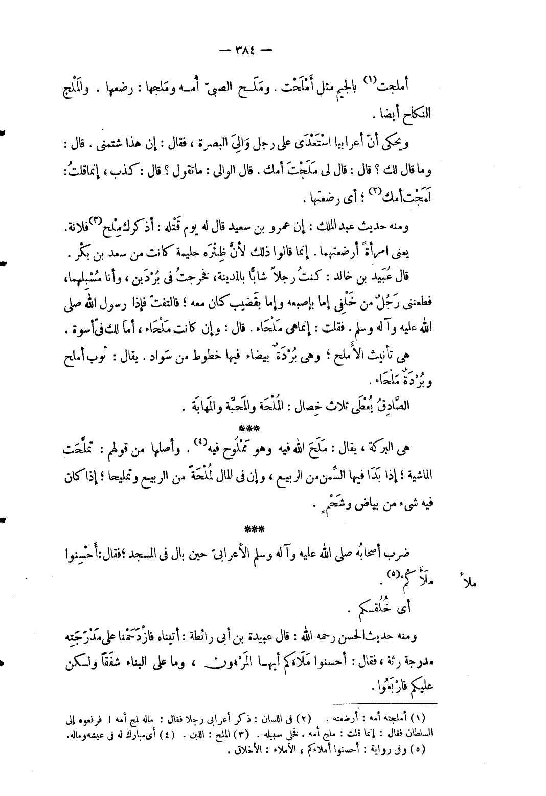 أملجت بِالْجِيم مثل أملحت. وملح الصَّبِي أُمه وملجها: رضعها: والملج النِّكَاح أَيْضا. ويحكى أَن أَعْرَابِيًا استعدى على رجل والى الْبَصْرَة فَقَالَ: إِن هَذَا شَتَمَنِي: قَالَ: وَمَا قَالَ لَك قَالَ: قَالَ لي ملجت أمك. قَالَ الْوَالِي: مَا تَقول قَالَ: كذب إِنَّمَا قلت: لمجت أمك أَي رضعتها. وَمِنْه حَدِيث عبد الْملك: إِن عَمْرو بن سعيد قَالَ لَهُ يَوْم قَتله: أذكرك ملح فُلَانَة. يَعْنِي امْرَأَة أرضعتها. إِنَّمَا قَالُوا ذَلِك لأنَّ ظئره حليمة كَانَت من سعد بن بكر. قَالَ عبيد بن خَالِد: كنت رجلا شاباًّ بِالْمَدِينَةِ فَخرجت فِي بردين وَأَنا مسبلهما فطعنني رجل من خَلْفي إِمَّا بإصبعه وَإِمَّا بقضيب كَانَ مَعَه فَالْتَفت فَإِذا رَسُول الله صلى الله عَلَيْهِ وَسلم. فَقلت: إِنَّمَا هِيَ ملحاء. قَالَ: وَإِن كَانَت ملحاء أما لَك فيَّ أُسْوَة. هِيَ تَأْنِيث الأملح وَهِي بردة بَيْضَاء فِيهَا خطوط من سَواد. يُقَال: ثوب أَمْلَح وبردة ملحاء. الصَّادق يُعْطي ثَلَاث خِصَال: الملحة والمحبة والمهابة. هِيَ الْبركَة يُقَال: ملح الله فِيهِ وَهُوَ مملوح فِيهِ. وَأَصلهَا من قَوْلهم: تملَّحت الْمَاشِيَة إِذا بدا فِيهَا السِّمن من الرّبيع وَإِن فِي المَال لملحة من الرّبيع وتمليحا إِذا كَانَ فِيهِ شَيْء من بَيَاض وشحم.