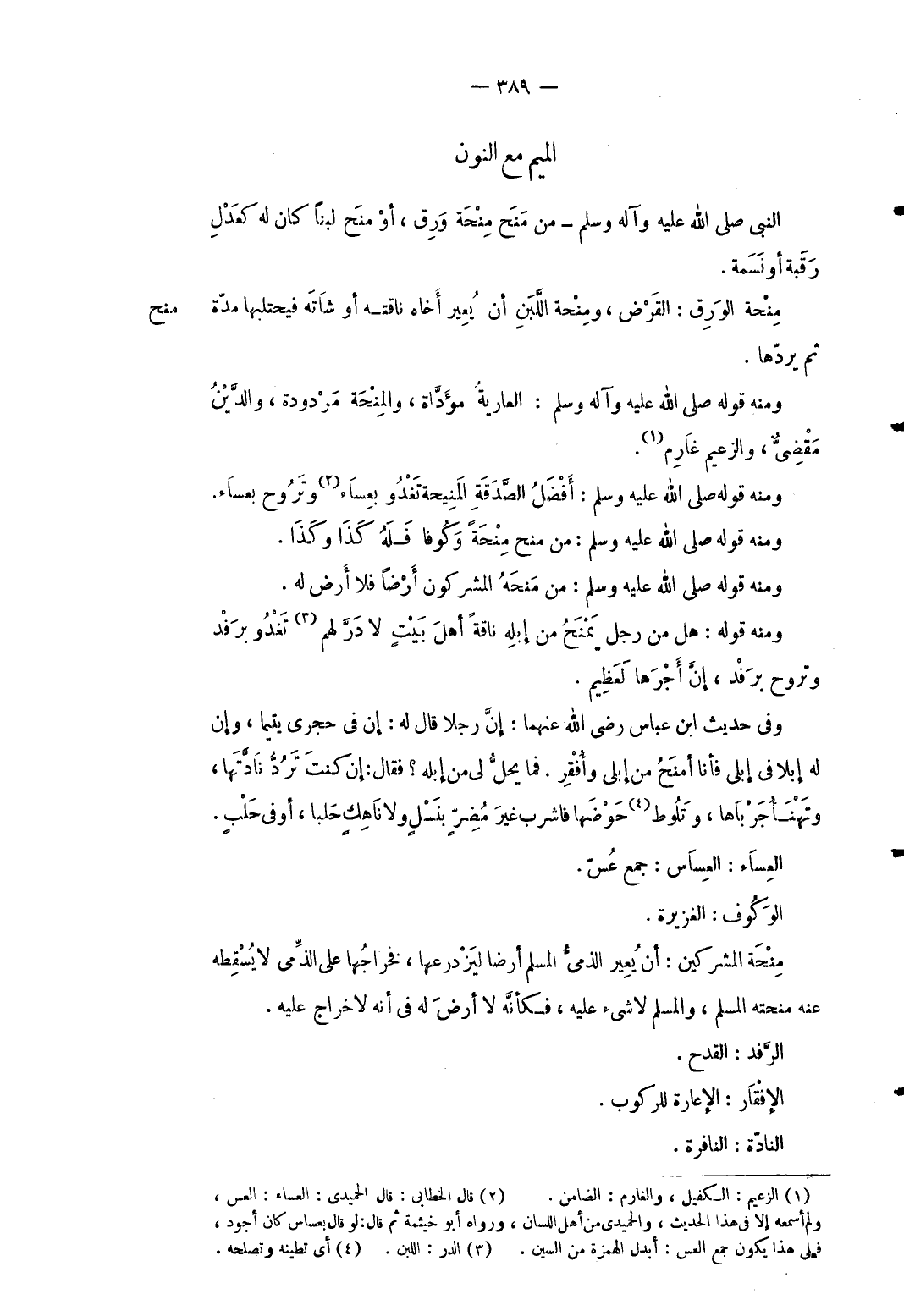 منح النَّبِي صلى الله عَلَيْهِ وَسلم من منح منحة ورق أَو منج لَبَنًا كَانَ لَهُ كَعدْل رَقَبَة أَو نسمَة. منحة الْوَرق: الْقَرْض ومنحة اللَّبن أَن يعير أَخَاهُ نَاقَته أَو شاته فيحتلبها مدّة ثمَّ يردّها. وَمِنْه قَوْله صلى الله عَلَيْهِ وَسلم: الْعَارِية مُؤَدَّاة والمنحة مَرْدُودَة وَالدّين نقضي والزعيم غَارِم. وَمِنْه قَوْله صلى الله عَلَيْهِ وَسلم: أفضل الصَّدَقَة المنيحة تَغْدُو بعساء وَتَروح بعساء. وَمِنْه قَوْله صلى الله عَلَيْهِ وَسلم: من منح منحة وكوفا فَلهُ كَذَا وَكَذَا. وَمِنْه قَوْله صلى الله عَلَيْهِ وَسلم: من منحه الْمُشْركُونَ أَرضًا فَلَا أَرض لَهُ. وَمِنْه قَوْله: هَل من رجل يمنح من إبِله نَاقَة أهل بَيت لَا درَّ لَهُم تَغْدُو برفد تروح برفد إِن أجرهَا لعَظيم. وَفِي حَدِيث ابْن عَبَّاس رَضِي الله تَعَالَى عَنْهُمَا: إِن رجلا قَالَ لَهُ: إِن فِي حجري يَتِيما وَإِن إبِلا فِي إبلي فَأَنا أمنح من إبلي وأُفقر. فَمَا يحلُّ لي من إبِله فَقَالَ: إِن كنت ترد نادتها تهنأ جَرْبَاهَا وَتَلوط حَوْضهَا فَاشْرَبْ غير مُضر بِنَسْل وَلَا نَاهِك حَلبًا أَو فِي حلب. العساء: العساس: جمع عسّ. الوكوف: الغزيرة. منحة الْمُشْركين: أَن يعير الذِّمِّيّ الْمُسلم أَرضًا ليزدرعها فخراجها على الذِّمِّيّ لَا يسْقطهُ مِنْهُ منحته الْمُسلم وَالْمُسلم لَا شَيْء عَلَيْهِ فَكَأَنَّهُ لَا أَرض لَهُ فِي أَنه لَا خراج عَلَيْهِ. الرَّفد: الْقدح. الإفقار: الْإِعَارَة للرُّكُوب. النادّة: النافرة.