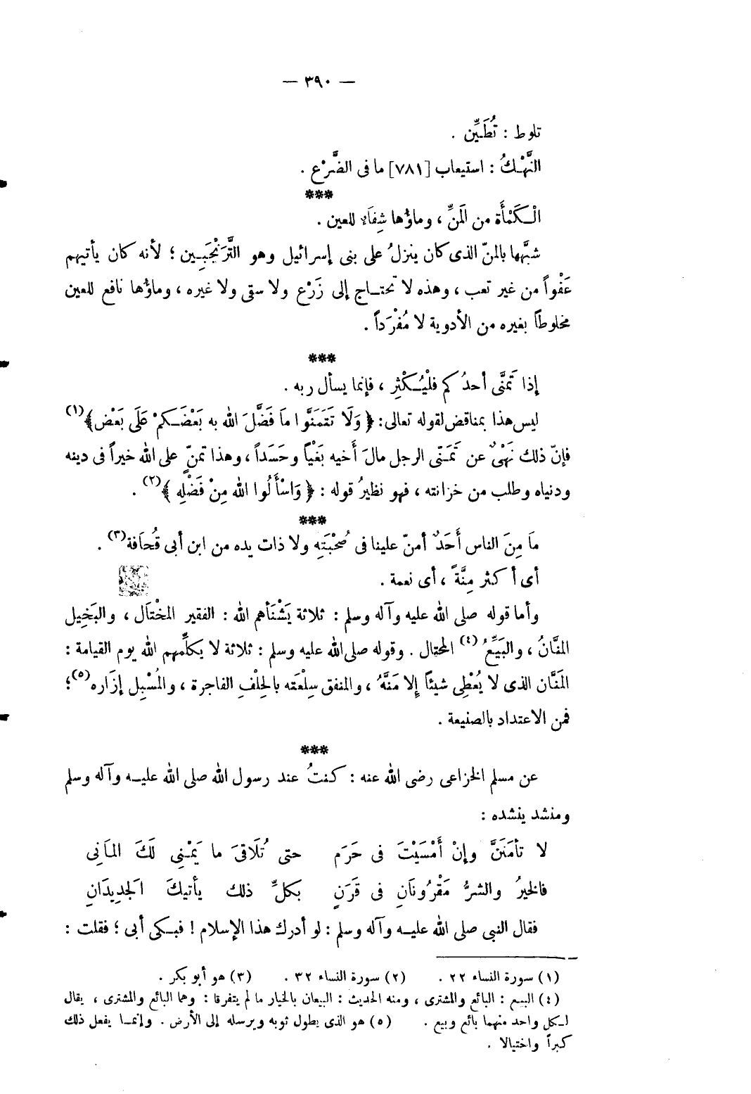 تلوط: تطيِّن. النَّهك: اسْتِيعَاب مَا فِي الضَّرع. الكمأة من المنِّ وماؤها شفاءٌ للعين. شبهها بالمنّ الَّذِي كَانَ ينزل على بني إِسْرَائِيل وَهُوَ الترنجبين لِأَنَّهُ كَانَ يأتيهما عفوا من غير تَعب وَهَذِه لَا تحتاح إِلَى زرع وَلَا سقِِي وَلَا غَيره وماؤها نَافِع للعين مخلوطاً بِغَيْرِهِ من الْأَدْوِيَة لَا مُفردا. إِذا تمنَّى أحدكُم فليكثر فَإِنَّمَا يسْأَل ربه. لَيْسَ هَذَا بمناقض لقَوْله تَعَالَى: {وَلاَ تَتَمَنَّوا مَا فَضَّلَ الله بِهِ بَعْضَكمْ عَلَى بَعْض} فَإِن ذَلِك نهي عَن تمني الرجل مَال أَخِيه بغياً وحسداً وَهَذَا تمن على الله خيرا فِي دينا ودنياه وَطلب من خزانته فَهُوَ نَظِير قَوْله: {وَاسْأَلُوا الله مِنْ فَضْلِه} . مَا من النَّاس أحد أَمن علينا فِي صحبته وَلَا ذَات يَده من ابْن أبي قُحَافَة. أَي أَكثر منَّة أَي نعْمَة. وَأما قَوْله صلى الله عَلَيْهِ وَسلم: ثَلَاثَة يشنأهم الله: الْفَقِير المختال والبخيل المنان وَالْبيع الْمُحْتَال. وَقَوله صلى الله عَلَيْهِ وَسلم: ثَلَاثَة لَا يكلمهم الله يَوْم الْقِيَامَة المنان الَّذِي لَا يُعْطي شَيْئا إِلَّا مِنْهُ والمنفق سلْعَته بِالْحلف الْفَاجِرَة والمسبل إزَاره فَمن الِاعْتِدَاد بالصنيعة. عَن مُسلم الْخُزَاعِيّ رَضِي الله عَنهُ: كنت عِنْد رَسُول الله صلى الله عَلَيْهِ وَسلم ومنشد ينشده: ... لَا تأمنن وَإِن أمسبت فِي حَرَم ... حَتَّى تُلاَقيَ مَا يَمْنِي لَكَ المَانِي ... فالخيرُ والشرُّ مَقْرُونَانِ فِي قَرَنٍ ... بكلِّ ذَلِك يأتيكَ الجَدِيدَانِ ... فَقَالَ النَّبِي صلى الله عَلَيْهِ وَسلم: لَو أدْرك هَذَا الْإِسْلَام فَبكى أبي فَقلت