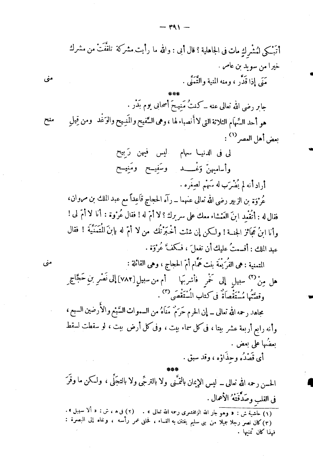 منى عُرْوَة بن الزبير رَضِي الله تَعَالَى عَنْهُمَا رَآهُ الْحجَّاج قَاعِدا مَعَ عبد الْملك بن مَرْوَان فَقَالَ لَهُ: أتُقعد ابْن العمشاء مَعَك على سريرك لَا أمّ لَهُ فَقَالَ عُرْوَة: أَنا لَا أم ل ي وَأَنا ابْن عَجَائِز الْجنَّة وَلَكِن إِن شِئْت أَخْبَرتك من لَا أم لَهُ يَابْنَ المتمنية فَقَالَ عبد الْملك: أَقْسَمت عَلَيْك أَن تفعل فَكف عُرْوَة. المتمنية: عي الفريعة بنت همَّام أم الْحجَّاج وَهِي القائلة: ... هَل مِنْ سبيلٍ إِلَى خَمْرٍ فأشربَها ... أم من سبيلٍ إِلَى نَصْرِ بنِ حَجَّاجِ ... وقصَّتها مستقصاة فِي كتاب المستقصي. مُجَاهِد رَحمَه الله تَعَالَى: إِن الْحرم حرمٌ مناه من السَّمَوَات السَّبع وَالْأَرضين السَّبع وَأَنه رَابِع أَرْبَعَة عشر بَيْتا فِي كل سَمَاء بَيت وَفِي كل أَرض بَيت لَو سَقَطت لسقط بَعْضهَا على بعض. أَي قَصده وحذاؤه وَقد سبق. الْحسن رَحمَه الله تَعَالَى لَيْسَ الْإِيمَان بالتمني وَلَا بالترجي وَلَا بالتجلي وَلَكِن مَا وقر فِي الْقلب وصدَّقته الْأَعْمَال.