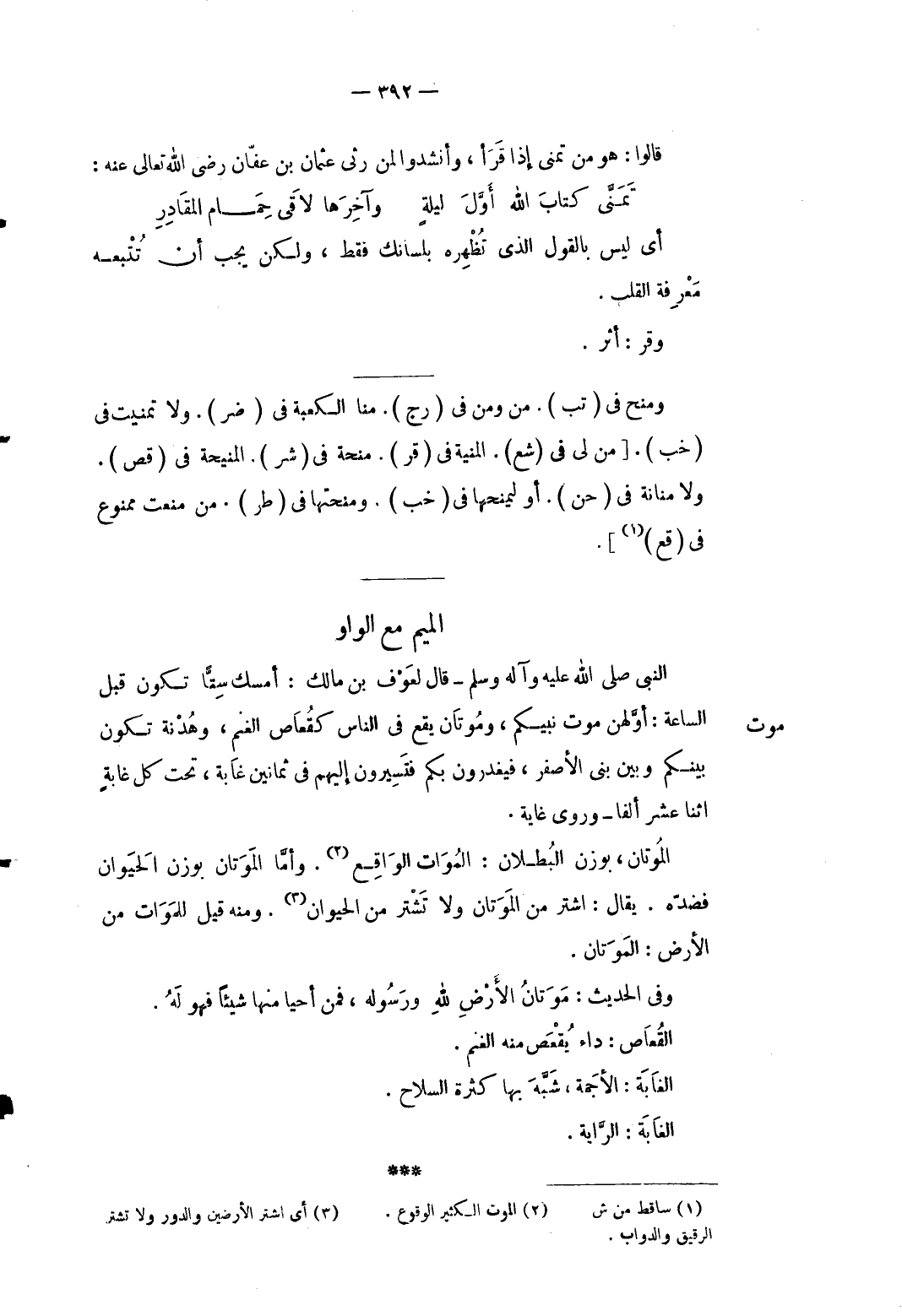موت النَّبِي صلى الله عَلَيْهِ وَسلم قَالَ لعوف بن مَالك: أمسك ستًّا تكون قبل السَّاعَة: أوَّلهن موت نَبِيكُم وموتان يَقع فِي النَّاس كقعاص الْغنم وهدنة تكون بَيْنكُم وَبَين بني الْأَصْفَر فيغدرون بكم فتسيرون إِلَيْهِم فِي ثَمَانِينَ غابة تَحت كل غابة اثْنَا عشر ألفا وروى غَايَة. الموتان: بِوَزْن الْبطلَان: الْموَات الْوَاقِع. وَأما الموتان بِوَزْن الْحَيَوَان فضدّه. يُقَال: اشْتَرِ من الموتان وَلَا تشتر مِنْهُ الْحَيَوَان. وَمن قيل للموات من الأَرْض: الموتان. وَفِي الحَدِيث: موتان الأَرْض لله وَرَسُوله فَمن أَحْيَا مِنْهَا شَيْئا فَهُوَ لَهُ. القعاص: دَاء يقعص مِنْهُ الْغنم. الغابة: الأجمة شبَّه بهَا كَثْرَة السِّلَاح. الغابة: الرَّايَة.