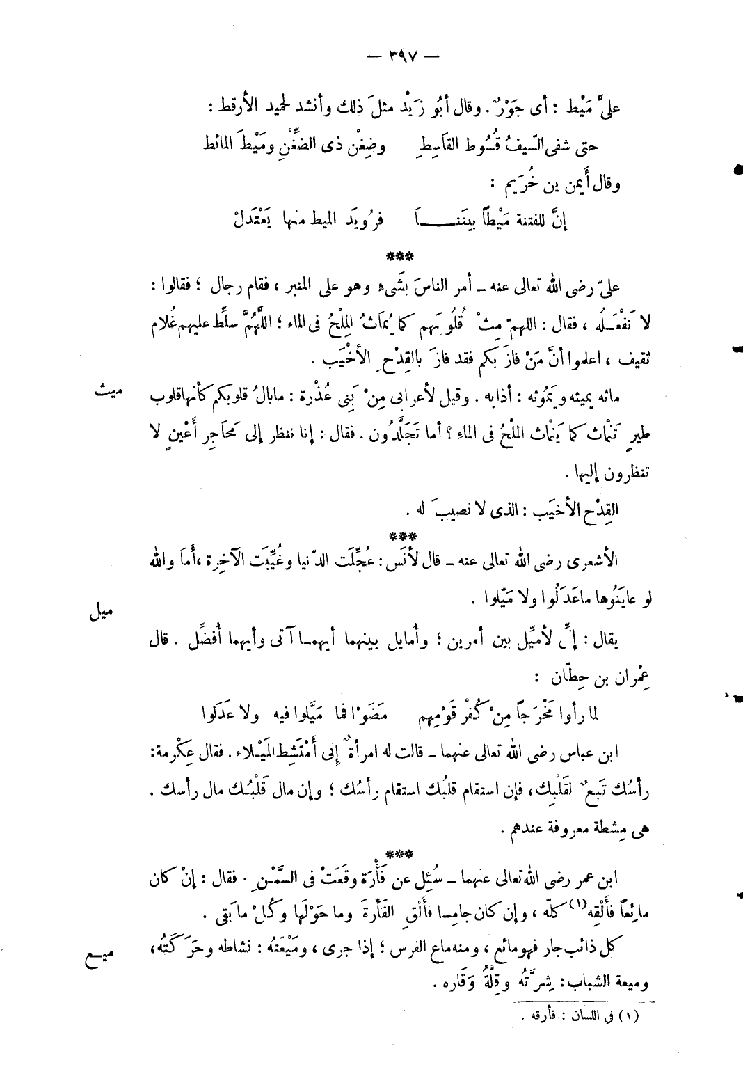 ميل الْأَشْعَرِيّ رَضِي الله تَعَالَى عَنهُ قَالَ لأنس: عُجِّلت الدُّنْيَا وغُيِّبت الْآخِرَة أما وَالله لَو عاينوها مَا عدلوا وَلَا ميلوا. يُقَال: إِنِّي لأميل بَين أَمريْن وأمايل بَينهمَا أَيهمَا آتى وَأيهمَا أُفضل. قَالَ عمرَان بن حطَّان: ... لما رَأَوْا مخرجا من كفر قَومهمْ ... مضوا فَمَا مَيَّلوا فِيهِ وَلَا عَدَلوا ... ابْن عَبَّاس رَضِي الله تَعَالَى عَنْهُمَا قَالَت لَهُ امْرَأَة إِنِّي أمتشط الميلاء. فَقَالَ عِكْرِمَة: رَأسك تبع لقلبك فَإِن استقام قَلْبك استقام رَأسك وَإِن مَال قَلْبك مَال رَأسك. هِيَ مشطة مَعْرُوفَة عِنْدهم.