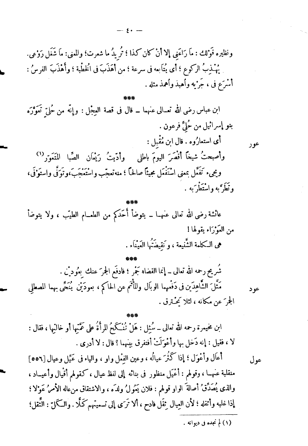 عور ابْن عَبَّاس رَضِي الله تَعَالَى عَنْهُمَا: قَالَ فِي قصَّة الْعجل وَإنَّهُ من حلي تعوره بَنو إِسْرَائِيل من حلي فِرْعَوْن. أَي استعاروه قَالَ ابْن مقبل: ... وأصبحتُ شَيخا أقْصَرَ اليومَ باطلي ... وأدّيتُ رَيْعَان الصِّبا المتَعَوّر ... وَيَجِيء تفعَّل بِمَعْنى استفعل مجيئاً صَالحا مِنْهُ تعجب واستعجب وَتوفى وَاسْتوْفى وتطربه واستطربه. عَائِشَة رَضِي الله تَعَالَى عَنْهَا يتَوَضَّأ أحدكُم من الطَّعَام الطّيب وَلَا يتَوَضَّأ من العوراء يَقُولهَا هِيَ الْكَلِمَة الشنيعة ونقيضتها العيناء.