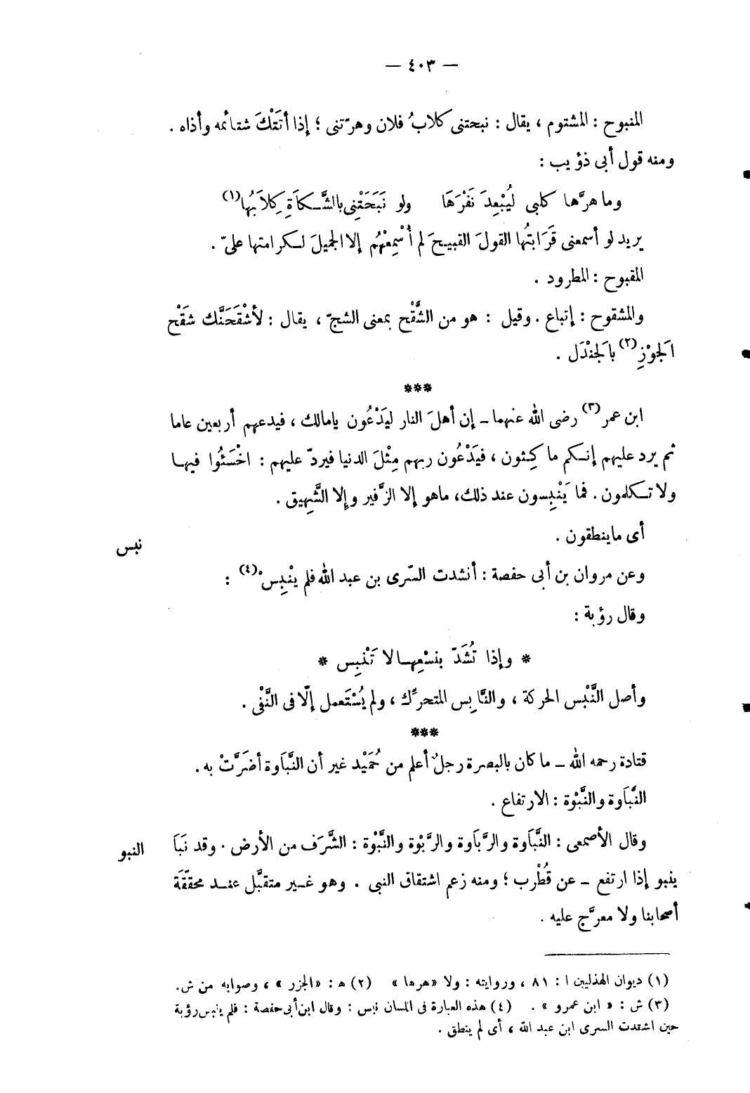 المنبوح: المشتوم يُقَال: نبحتني كلابُ فلَان وهرتني إِذا أتتك شتائمه وأذاه. وَمِنْه قَول أبي ذُؤَيْب: ... وَمَا هَّرها كَلْبِي ليُبْعِدَ نَفْرَهَا ... وَلَو نَبَحَتْنِي بالشَّكاَةِ كِلاَُبها ... يُرِيد لَو أسمعني قرابتها القَوْل الْقَبِيح لم أسمعهم إِلَّا الْجَمِيل لكرامتها على. المقبوح: المطرود. والمشقوح: إتباع. وَقيل: هُوَ من الشقح بِمَعْنى الشج يُقَال: لأشقحنك شقح الْجَوْز بالجندل.