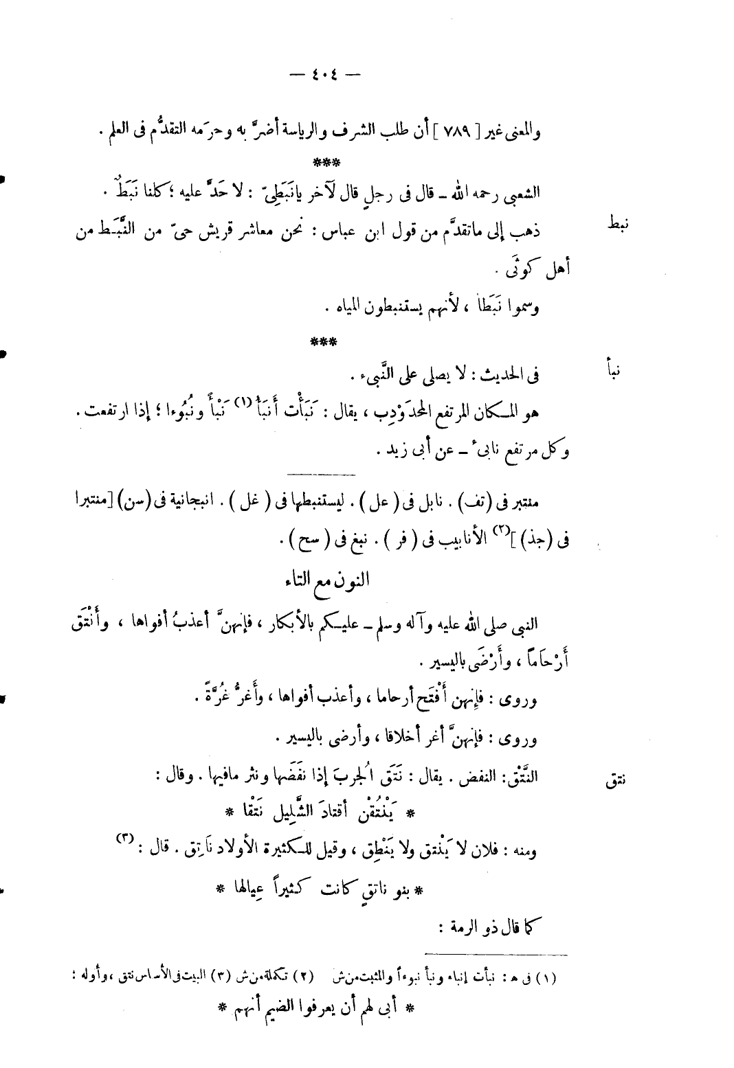 نبط الشّعبِيّ رَحْمَة الله قَالَ فِي رجل قَالَ لآخر يَا نبطي: لَا حد عَلَيْهِ كلنا نبط. ذهب إِلَى مَا تقدم من قَول ابْن عَبَّاس: نَحن معاشر قُرَيْش حَيّ من النبط من أهل كوثى. وَسموا نبطا لأَنهم يستنبطون الْمِيَاه.