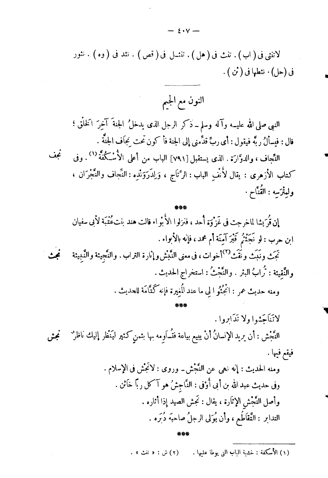نجث إِن قُريْشًا لما خرجت فِي غَزْوَة أُحد فنزلوا الْأَبْوَاء قَالَت هِنْد بنت عتبَة لأبي سُفْيَان ابْن حَرْب: لَو نجثتم قبر آمِنَة أم مُحَمَّد فَإِنَّهُ بالأبواء. نجث ونبث ونقث أَخَوَات فِي معنى النَّبش وإثارة التُّرَاب. والنَّجيثة والنَّبيثة والنَّقيثة: تُرَاب الْبِئْر. والنَّجث: اسْتِخْرَاج الحَدِيث. وَمِنْه حَدِيث عمر: انجثوا لي مَا عِنْد الْمُغيرَة فَإِنَّهُ كتامة للْحَدِيث.