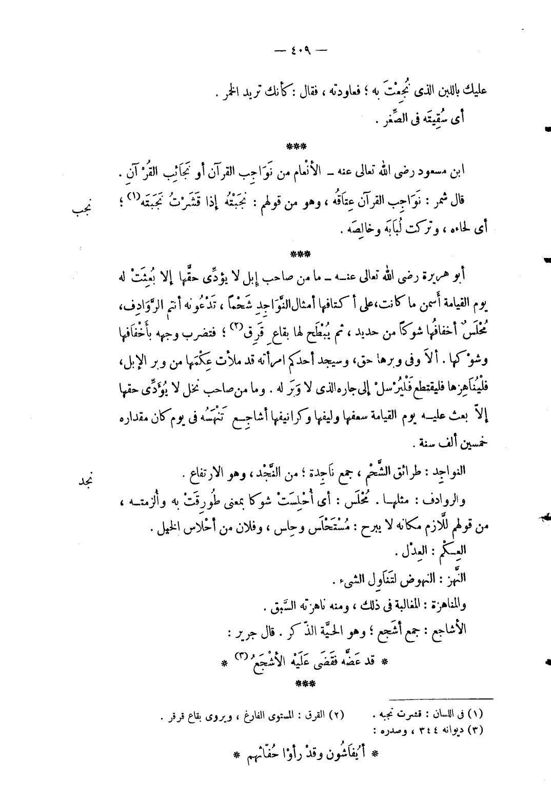 نجد أَبُو هُرَيْرَة رَضِي الله تَعَالَى عَنهُ مَا من صَاحب إبل لَا يُؤَدِّي حقَّها إِلَّا بُعثت لَهُ يَوْم الْقِيَامَة أسمن مَا كَانَت على أكتافها أَمْثَال النَّواجذ شحماً تَدعُونَهُ أَنْتُم الروادف مُحلس أخفافها شوكاً من حَدِيد ثمَّ يبطح لَهَا بقاع قرق فَتضْرب وَجهه بأخفافها وشوكها. أَلا وَفِي وبرها حق وسيجد أحدكُم امْرَأَته قد مَلَأت عكمها من وبر الْإِبِل فليناهزها فليقتطع فليرسل إِلَى جَاره الَّذِي لَا وبر لَهُ. وَمَا من صَاحب نخل لَا يُؤدى حَقّهَا إِلَّا بعث عَلَيْهِ يَوْم الْقِيَامَة سعفها وليفها وكرانيفها أشاجع تنهسه فِي يَوْم كَانَ مِقْدَاره خمسين ألف سنة. النواجد: طرائق الشَّحْم جمع ناجدة من النجد وَهُوَ الِارْتفَاع. والروادف: مثلهَا. مُحلس: أَي أُحلست شوكا بِمَعْنى طُورقت بِهِ وأُلزمته من قَوْلهم للاَّزم مَكَانَهُ لَا يبرح: مستحلس وحلس وَفُلَان من أحلاس الْخَيل. العكم: الْعدْل. النَّهز: النهوض لتناول الشَّيْء. والمناهزة: المغالبة فِي ذَلِك وَمِنْه ناهزته السَّبق. الأشاجع: جمع أَشْجَع وَهُوَ الحيَّة الذّكر. قَالَ جرير: ... قد عضه فَقضى عَلَيْهِ الأشجع ...