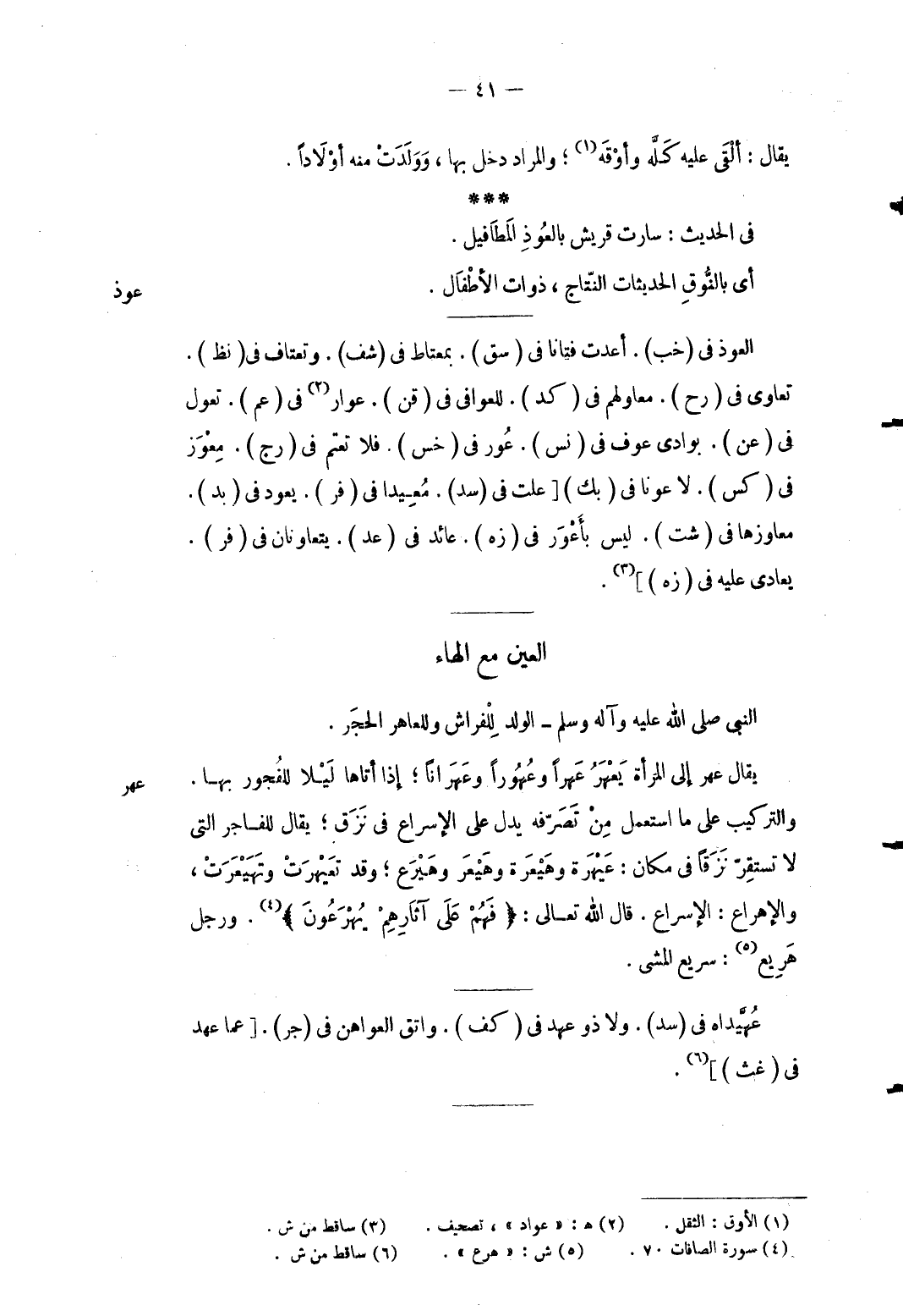 النَّبِي صلى الله عَلَيْهِ وَسلم الْوَلَد للْفراش وللعاهر الْحجر. يُقَال عهر إِلَى الْمَرْأَة يعهر عهراً وعهوراً وعهراناً إِذا أَتَاهَا لَيْلًا للفجور بهَا. والتركيب على مَا اسْتعْمل من تصرفه يدل على الْإِسْرَاع فِي نزق يُقَال لِلْفَاجِرِ الَّتِي لَا تَسْتَقِر نزقاً فِي مَكَان عيهرة وهيعرة وهيعر وهيرع وَقد تعيهرت وتهيعرت والإهراع الْإِسْرَاع قَالَ الله تَعَالَى {فَهُمْ عَلَى آثَارِهِمْ يُهْرَعُونَ} وَرجل هريع: سريع الْمَشْي