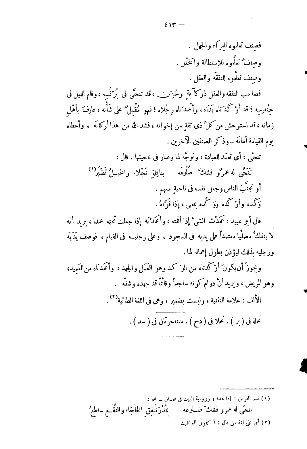 فصنف تعلموه للمراء وَالْجهل. وصنفٌ تعلَّموه للاستطالة والختل. وصنف تعلموه للتفقه وَالْعقل. فَصَاحب التفقه وَالْعقل ذُو كآبة وحزن قد تنحى فِي برنسه وَقَامَ اللَّيْل فِي حندسه قد أَو كدتاه يَدَاهُ وأعمدتاه رِجْلَاهُ فَهُوَ مقبل على شَأْنه عارفٌ بِأَهْل زَمَانه قد استوحش من كلِّ ذِي ثِقَة من إخوانه فَشد الله من هَذَا أَرْكَانه وَأَعْطَاهُ يَوْم الْقِيَامَة أَمَانه وَذكر الصِّنْفَيْنِ الآخرين. تنحى: أَي تعمّد لِلْعِبَادَةِ وَتوجه لَهَا وَصَارَ فِي ناحيتها. قَالَ: ... تَنَحَّى لَهُ عمرٌو فشكَّ ضُلُوعَه ... بنافِلةٍ نَجْلاء والخيلُ تَضْبُر ... أَو تجنب النَّاس وَجعل نَفسه فِي نَاحيَة مِنْهُم. وكده وأوكده ووكده بِمَعْنى إِذا قوَّاه. قَالَ أَبُو عبيد: عَمَدت الشَّيْء إِذا أقمته وأعمدته إِذا جعلت تَحْتَهُ عمدا يُرِيد أَنه لَا ينفكُّ مصلِّيا مُعْتَمدًا على يَدَيْهِ فِي السُّجُود وعَلى رجلَيْهِ فِي الْقيام فوصف يَدَيْهِ وَرجلَيْهِ بذلك ليؤذن بطول إعماله لَهَا. وَيجوز أَن يكون أوكدتاه من الوكد وَهُوَ الْعَمَل والجهد وأعمدتاه من العميد وَهُوَ الْمَرِيض وَيُرِيد أَن دوَام كَونه سَاجِدا وَقَائِمًا قد جهده وشفّه. الْألف: عَلامَة التَّثْنِيَة وَلَيْسَت بضمير وَهِي فِي اللُّغَة الطائية.