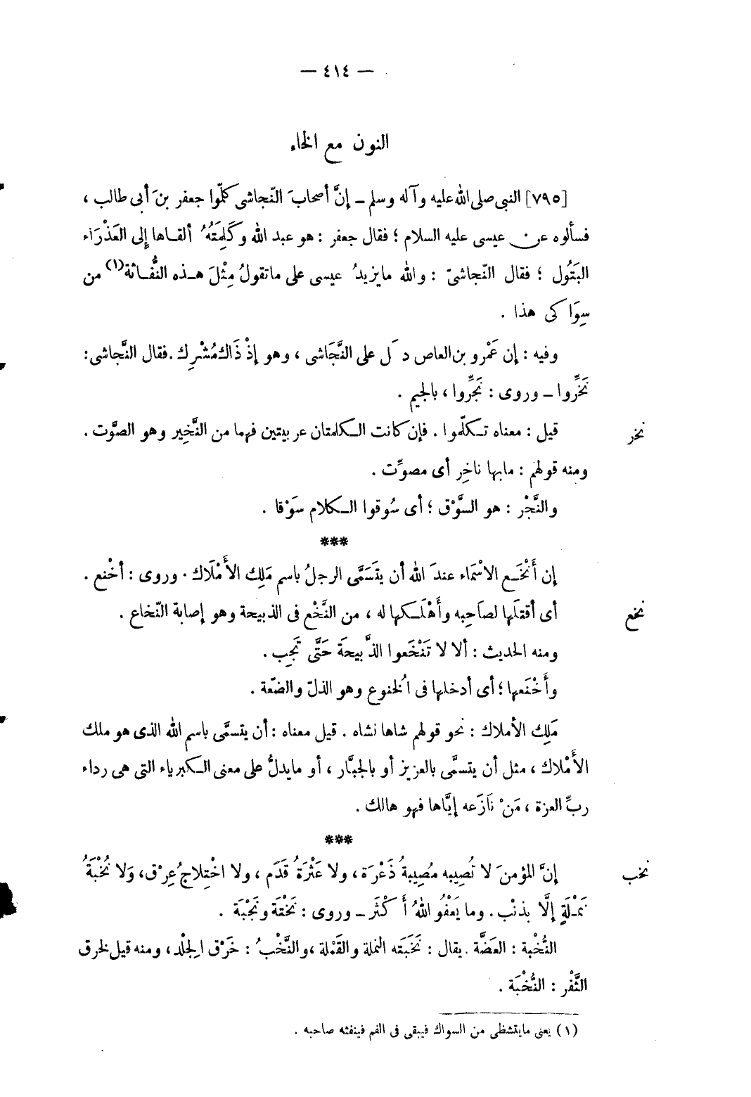 نخر النَّبِي صلى الله عَلَيْهِ وَسلم إنَّ أَصْحَاب النَّجَاشِيّ كلموا جَعْفَر بن أبي طَالب فَسَأَلُوهُ عَن عِيسَى عَلَيْهِ السَّلَام فَقَالَ جَعْفَر: هُوَ عبد الله وكلمته أَلْقَاهَا إِلَى الْعَذْرَاء البتول فَقَالَ النَّجَاشِيّ: وَالله مَا يزِيد عِيسَى على مَا تَقول مثل هَذِه النُّفاثة من سِوَاكِي هَذَا. وَفِيه: إِن عَمْرو بن الْعَاصِ د ل على النَّجَاشِيّ وَهُوَ إِذْ ذَاك مُشْرك. فَقَالَ النَّجاشي: نخِّروا وروى: نجِّروا بِالْجِيم. قيل: مَعْنَاهُ تكلّموا. فَإِن كَانَت الكلمتان عربيتين فهما من النخير وَهُوَ الصَّوْت. وَمِنْه قَوْلهم: مَا بهَا ناخر أَي مصوِّت. والنَّجر: هُوَ السُّوق: أَي سوقوا الْكَلَام سوقا.
