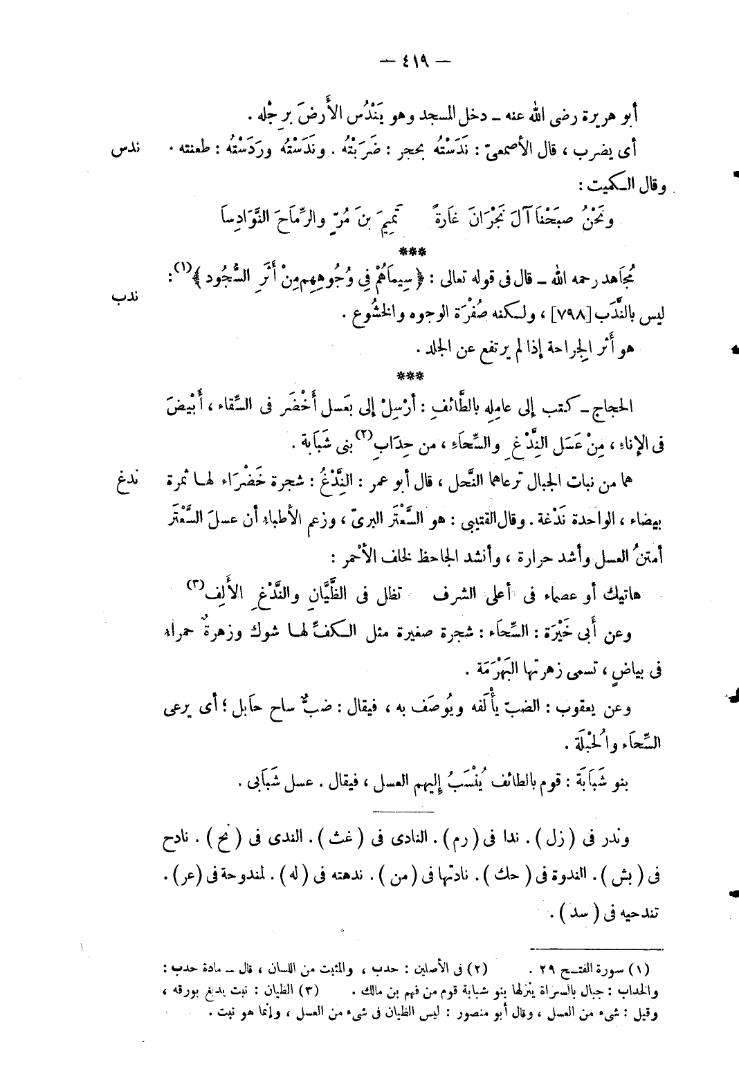ندب مُجَاهِد رَحمَه الله قَالَ فِي قَوْله تَعَالَى: {سِيمَاهُمْ فِي وُجُوهِهِم مِنْ أَثَرِ السُّجُود} لَيْسَ بالندب وَلكنه صفرَة الْوُجُوه والخشوع. هُوَ أثر الْجراحَة إِذا لم يرْتَفع عَن الْجلد.