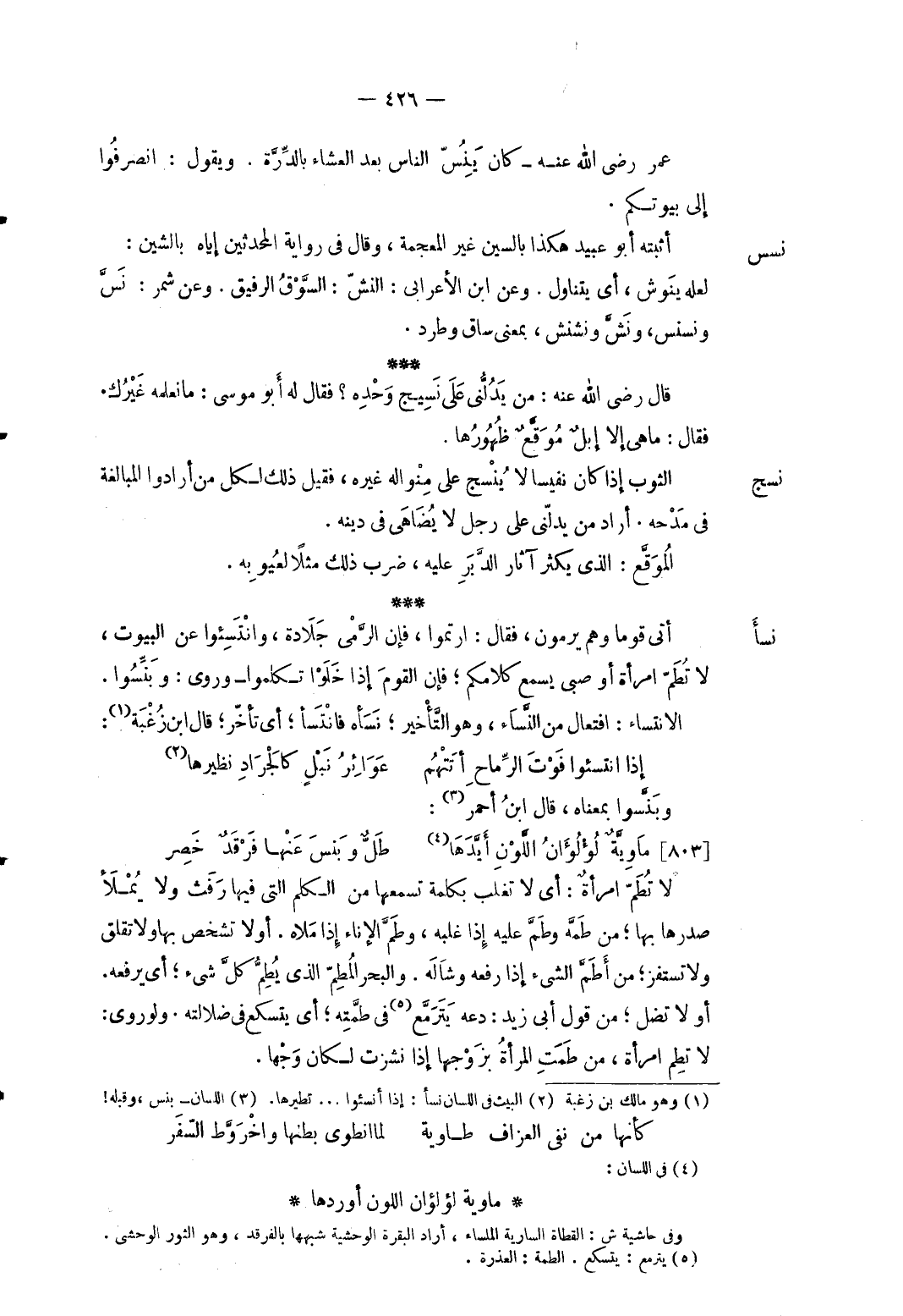 نسس عمر رَضِي الله عَنهُ كَانَ ينسّ النَّاس بعد الْعشَاء بِالدرةِ. وَيَقُول: انصرفوا إِلَى بُيُوتكُمْ. أثْبته أَبُو عبيد هَكَذَا بِالسِّين غير الْمُعْجَمَة وَقَالَ فِي رِوَايَة الْمُحدثين إِيَّاه بالشين: لَعَلَّه ينوش أَي يتَنَاوَل. وَعَن ابْن الْأَعرَابِي: النشّ: السُّوق الرفيق. وَعَن شمر: نسَّ ونسنس ونشَّ ونشنش بِمَعْنى سَاق وطرد.