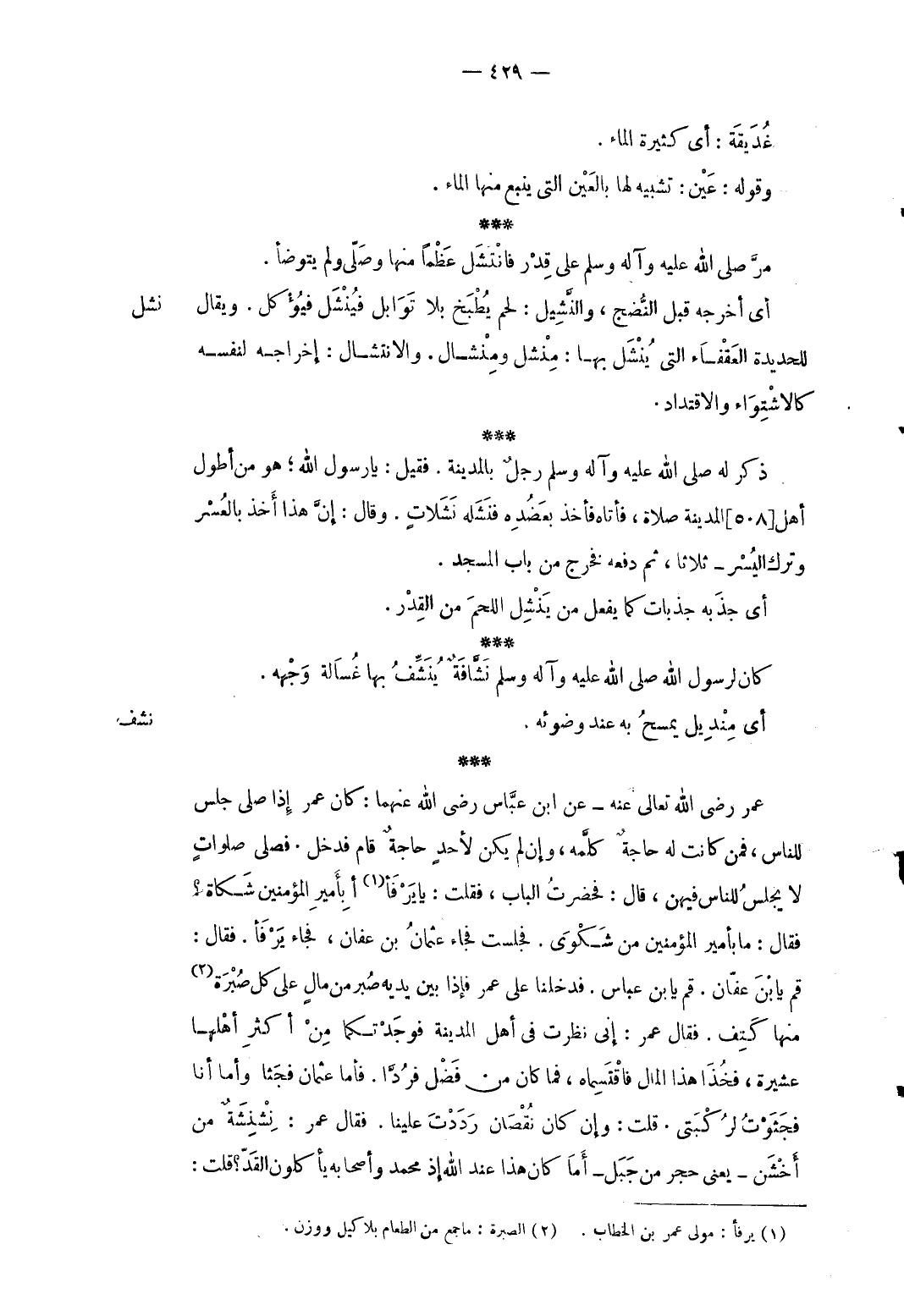 نشف كَانَ لرَسُول الله صلى عَلَيْهِ الله وَآله وَسلم نشَّافة ينشِّف بهَا غُسالة وَجهه. أَي منديل يمسح بِهِ عِنْد وضوئِهِ. عمر رَضِي الله تَعَالَى عَنهُ عَن ابْن عَبَّاس رَضِي الله عَنْهُمَا: كَانَ عمر إِذا صلى جلس للنَّاس فَمن كَانَت لَهُ حَاجَة كَلمه وَإِن لم يكن لأحد حَاجَة قَامَ فَدخل. فصلى صلوَات لَا يجلس للنَّاس فِيهِنَّ قَالَ: فَحَضَرت الْبَاب فَقلت: يَا يرفأ أبأمير الْمُؤمنِينَ شكاة فَقَالَ: مَا بأمير الْمُؤمنِينَ من شكوى. فَجلت فجَاء عُثْمَان بن عَفَّان فجَاء يرفأ. فَقَالَ: قُم يَابْنَ عَفَّان. قُم يَابْنَ عَبَّاس. فَدَخَلْنَا على عمر فَإِذا بَين يَدَيْهِ صَبر من مالٍ على كل صبرَة مِنْهَا كتف. فَقَالَ عمر: إِنِّي نظرت فِي أهل الْمَدِينَة فوجدتكما من أَكثر أَهلهَا عشيرة فخذا هَذَا المَال فاقتسماه فَمَا كَانَ من فضل فرُدَّا. فَأَما عُثْمَان فَجَثَا وَأما أَنا فجثوت لركبتي. قلت: وَإِن كَانَ نُقْصَان رددت علينا. فَقَالَ عمر: نشنشة من أخشن يَعْنِي حجر من جبل أما كَانَ هَذَا عِنْد الله إِذْ مُحَمَّد وَأَصْحَابه يَأْكُلُون القدّ قلت:
