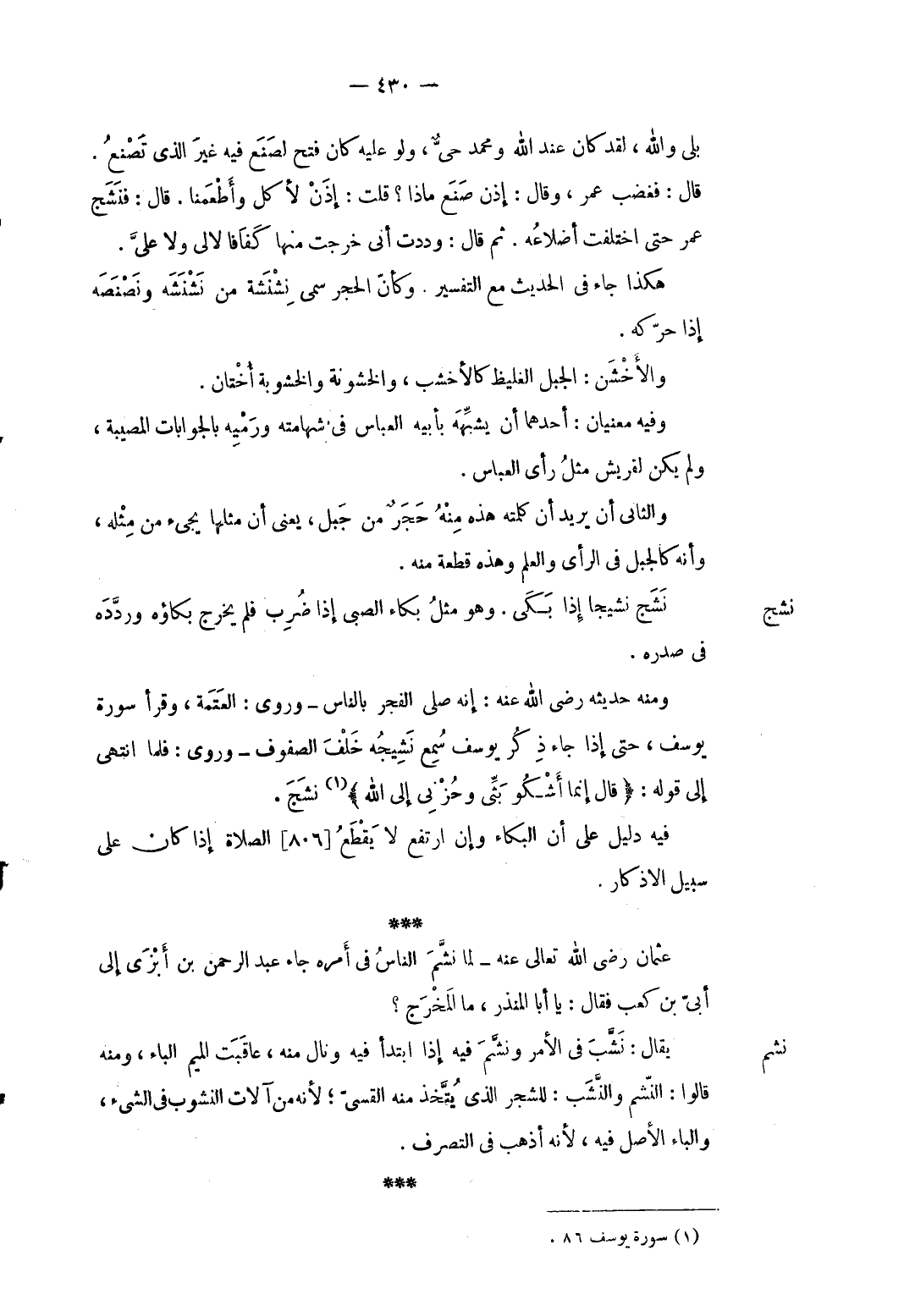 بلَى وَالله لقد كَانَ عِنْد الله وَمُحَمّد حيٌّ وَلَو عَلَيْهِ كَانَ فتح لصنع فِيهِ غير الَّذِي تصنع. قَالَ: فَغَضب عمر وَقَالَ: إِذن صنع مَاذَا قلت: إِذن لأكل وأطعمنا. قَالَ:: فنشج عمر حَتَّى اخْتلفت أضلاعه. ثمَّ قَالَ: وددت أَنِّي خرجت مِنْهَا كفافا لَا لي وَلَا عليَّ. هَكَذَا جَاءَ فِي الحَدِيث مَعَ التَّفْسِير. وَكَأن الْحجر سمي نشنشة من نشنشه ونصنصه إِذا حرّكه. والأخشن: الْجَبَل الغليظ كالأخشب والخشونة والخشوبة أختَان. وَفِيه مَعْنيانِ: أَحدهمَا أَن بشبهه بِأَبِيهِ الْعَبَّاس فِي شهامته ورميه بالجوابات الْمُصِيبَة وَلم يكن لقريش مثل مَا رَأْي الْعَبَّاس. وَالثَّانِي: أَن يُرِيد أَن كَلمته هَذِه مِنْهُ حجر من جبل يَعْنِي أَن مثلهَا يَجِيء من مثله وَأَنه كالحبل فِي الرَّأْي وَالْعلم وَهَذِه قِطْعَة مِنْهُ. نشج نشيجا إِذا بَكَى. وَهُوَ مثل بكار الصَّبِي إِذا ضُرب فَلم يخرج بكاؤه وردده فِي صَدره. وَمِنْه حَدِيثه رَضِي الله عَنهُ: إِنَّه صلى الْفجْر بِالنَّاسِ وروى: الْعَتَمَة وَقَرَأَ سُورَة يُوسُف حَتَّى إِذا جَاءَ ذكر يُوسُف سُمع نَشِيجه خلف الصُّفُوف وروى: فَلَمَّا انْتهى إِلَى قَوْله: {قَالَ إِنَّمَا أَشْكُو بَثِّي وحُزْنِي إِلَى الله} نشَجَ. فِيهِ دَلِيل على أَن الْبكاء وَإِن ارْتَفع لَا يقطع الصَّلَاة إِذا كَانَ على سَبِيل الْأَذْكَار.
