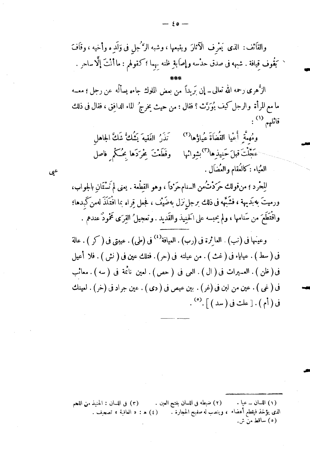 عي الزُّهْرِيّ رَحمَه الله تَعَالَى: إِن بريداً من بعض الْمُلُوك جَاءَهُ يسْأَله عَن رجل مَعَه مَا مَعَ الْمَرْأَة وَالرجل كَيفَ يُورث فَقَالَ: من حَيْثُ يخرج المَاء الدافق فَقَالَ فِي ذَلِك قَائِلهمْ ... ومُهِمَّةٍ أَعْيا القُضَاةَ عُياؤُها ... تَذَرُ الفَقيهَ يَشُكُّ شَكَّ الجاهلِ ... عَجَّلْتَ قبلَ حَنِيذِها بشوائها ... وَقطعت محردها بِحكم فاصل ... العياء: كالمقام والعضال المحرد من قَوْلك حردت من السنام حرداً وَهُوَ الْقطعَة يَعْنِي لم تستان بِالْجَوَابِ ورميت بِهِ بديهة فشبهه فِي ذَلِك بِرَجُل نزل بِهِ ضيف فَجعل قراه بِمَا افتلذ لَهُ من كَبِدهَا واقتطع من سنامها وَلم يحْبسهُ على الحنيذ والقديد وتعجيل الْقرى مَحْمُود عِنْدهم