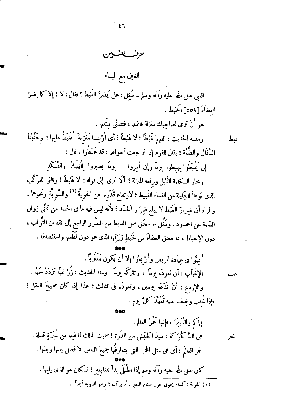 غبط النَّبِي صلى الله عَلَيْهِ وَسلم سُئِلَ: هَل يضر الْغَبْطُ فَقَالَ: لَا إِلَّا كَمَا يضر العضاه الْخبط هُوَ أَن ترى لصاحبك منزلَة فاضلة فتتمنى مثلهَا وَمِنْه الحَدِيث اللَّهُمَّ غبطاً لَا هبطاً أَي أولنا منزلَة نغبط عَلَيْهَا وجنبنا السفال والضعة يُقَال للْقَوْم إِذا تراجعت أَحْوَالهم قد هَبَطُوا قَالَ ... إِن يُغْبَطُوا يهبِطوا يَوْمًا وَإِن أُمِروا ... يَوْمًا يصيروا لِلْهُلْكُ والنَّكَدِ ... ومجاز الْكَلِمَة النبل ورفعة الْمنزلَة أَلا ترى إِلَى قَوْله لَا هبطاً وَقَالُوا للمركب الَّذِي يُوطأ للجليلة من النِّسَاء الغبيط لارْتِفَاع قدره عَن الحوية والسوية وَنَحْوهمَا وَالْمرَاد أَن ضرار الْغَبْطُ لَا يبلغ ضرار الْحَسَد لِأَنَّهُ لَيْسَ فِيهِ مَا فِي الْحَسَد من تمني زَوَال النِّعْمَة عَن الْمَحْسُود وَمثل مَا يلْحق عمل الغابط من الضَّرَر الرَّاجِع إِلَى نُقْصَان الثَّوَاب دون الإحباط بِمَا يلْحق العضاه من خبط وَرقهَا الَّذِي هُوَ دون قطعهَا واستئصالها