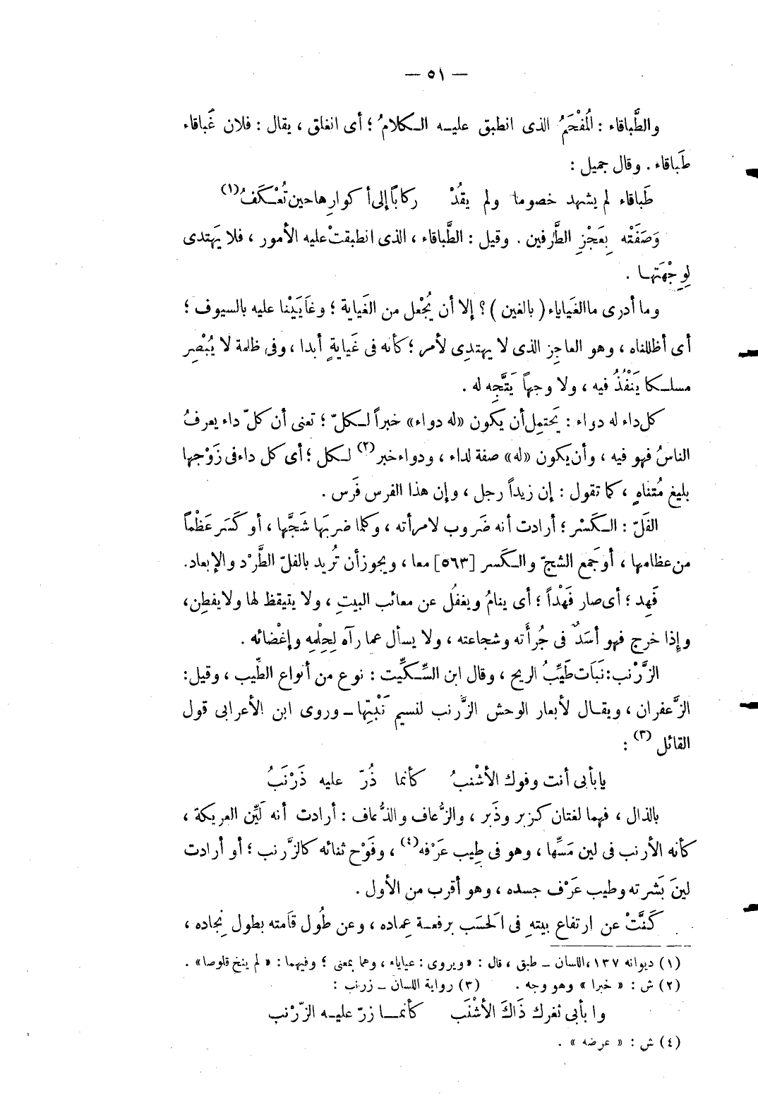 والطباقاء: المفحم الَّذِي انطبق عَلَيْهِ الْكَلَام أَي انغلق يُقَال فلَان غباقاء طباقاء وَقَالَ جميل: ... طباقاء لم يشْهد خصوما وَلم يقُدْ ... ركاباً إِلَى أكوارِها حِين تُعْكَفُ ... وَصفته بعجز الطَّرفَيْنِ وَقيل: الطباقاء الَّذِي انطبقت عَلَيْهِ الْأُمُور فَلَا يَهْتَدِي لوجهتها. وَمَا أَدْرِي مَا الغياياء (بالغين) إِلَّا أَن يَجْعَل من الغياية وغايينا بِالسُّيُوفِ أَي أظللناه وَهُوَ الْعَاجِز الَّذِي لَا يَهْتَدِي لأمر كَأَنَّهُ فِي غياية أبدا وَفِي ظلمَة لَا يبصر مسلكا ينفذ فِيهِ وَلَا وَجها يتَّجه لَهُ. كل دَاء: (لَهُ دَوَاء) يحْتَمل أَن يكون لَهُ دَوَاء خَبرا لكلّ تَعْنِي أَن كلّ دَاء يعرف النَّاس فَهُوَ فِيهِ وَأَن يكون (لَهُ) صفة لداء ودواء خبر لكل أَي كل دَاء فِي زَوجهَا بليغ متناهٍ كَمَا تَقول: إِن زيدا رجل وَإِن هَذَا الْفرس فرس. الفلّ الْكسر أَرَادَت أَنه ضروب لامْرَأَته وَكلما ضربهَا شجَّها أَو كسر عظما من عظامها أَو جمع الشج وَالْكَسْر مَعًا وَيجوز أَن تُرِيدُ بالفلّ الطَّرْد والإبعاد فَهِد أَي صَار فهداً أَي ينَام ويغفل عَن معائب الْبَيْت وَلَا يتيقظ لَهَا وَلَا يفْطن وَإِذا خرج فَهُوَ أَسد فِي جرأته وشجاعته وَلَا يسْأَل عَمَّا رَآهُ لحلمه وإغضائه. الزرنب: نَبَات طيب الرّيح وَقَالَ ابْن السِّكِّيت: نوع من أَنْوَاع الطّيب وَقيل: الزَّعْفَرَان وَيُقَال لأبعار الْوَحْش الزرنب لنسيم نبتها وروى ابْن الْأَعرَابِي قَول الْقَائِل: ... يَا أبي أَنْت وفوك الأشْنبُ ... كَأَنَّمَا ذُرّ عَلَيْهِ ذَرْنَبُ ... بِالذَّالِ فهما لُغَتَانِ كزبر وذبر والزُّعاف والذُّعاف أَرَادَت أَنه لين العريكة كَأَنَّهُ الأرنب فِي لين مَسهَا وَهُوَ فِي طيب عرفه وفوح ثَنَاء كالزرنب أَو أَرَادَت لين بَشرته وَطيب عرف جسده وَهُوَ أقرب من الأول. كنت عَن ارْتِفَاع بَيته فِي الْحسب برفعة عماده وَعَن طول قامته بطول نجاده