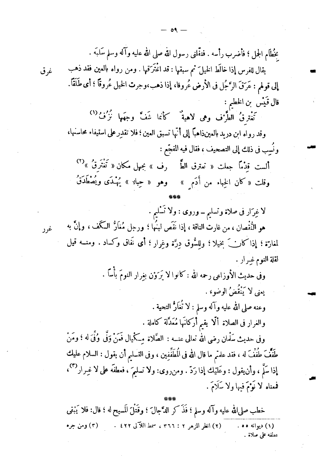 غرر لَا غرار فِي صَلَاة وَتَسْلِيم وروى: وَلَا تَسْلِيم. هُوَ النُّقْصَان من غارت النَّاقة إِذا نقص لَبنهَا وَرجل مغارُّ الْكَفّ وإنَّ بِهِ لمغارّة إِذا كَانَ بَخِيلًا وللسوق درة وغرار أَي نفاق وكساد وَمِنْه قيل لقلَّة النُّون غرار. وَفِي حَدِيث الْأَوْزَاعِيّ رَحمَه الله: كَانُوا لَا يرَوْنَ بغرار النّوم بَأْسا يَعْنِي لَا ينْقض الْوضُوء وَعنهُ صلى الله عَلَيْهِ وَسلم: لَا تغار التَّحِيَّة والغرار فِي الصَّلَاة أَلا يُقيم أَرْكَانهَا معدلة كَامِلَة. وَفِي حَدِيث سلمَان رَضِي الله تَعَالَى عَنهُ الصَّلَاة مكيال فَمن وفى وفى لَهُ وَمن طفف طفف لَهُ فقد علمْتُم مَا قَالَ الله فِي المطففين: وَفِي التَّسْلِيم أَن يَقُول: السَّلَام عَلَيْك إِذا سلَّم وَأَن يَقُول وَعَلَيْك إِذا رد وَمن روى: وَلَا تَسْلِيم فعطفه على غرار فَمَعْنَاه لَا نوم فِيهَا وَلَا سَلام. خطب صلى الله عَلَيْهِ وَسلم فَذكر الدَّجَّال وَقتل الْمَسِيح لَهُ قَالَ: فَلَا يبْقى