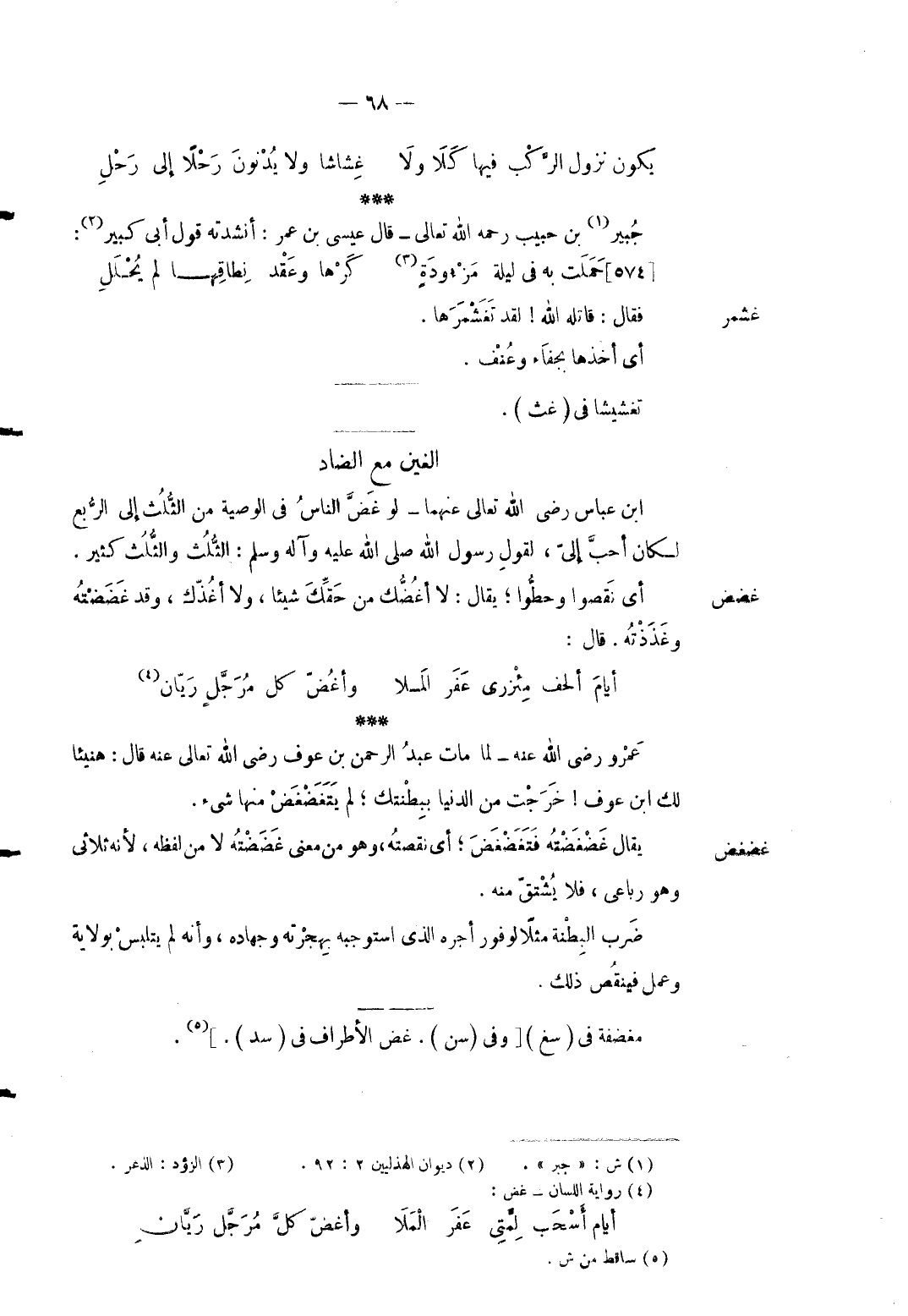 غضض ابْن عَبَّاس رَضِي الله تَعَالَى عَنْهُمَا لَو غضَّ النَّاس فِي الْوَصِيَّة من الثُّلُث إِلَى الرّبع لَكَانَ أحبَّ إليّ لقَوْل رَسُول الله صلى الله عَلَيْهِ وَسلم: الثُّلُث وَالثلث كثير. أَي نَقَصُوا وحطُّوا يُقَال: لَا أغضُّك من حَقك شَيْئا وَلَا أغذك وَقد غضضته وغذذته. قَالَ: ... أيامَ ألحف مِئْزري عَفَر المَلا ... وأغض كل مرجل رَيَّان ...