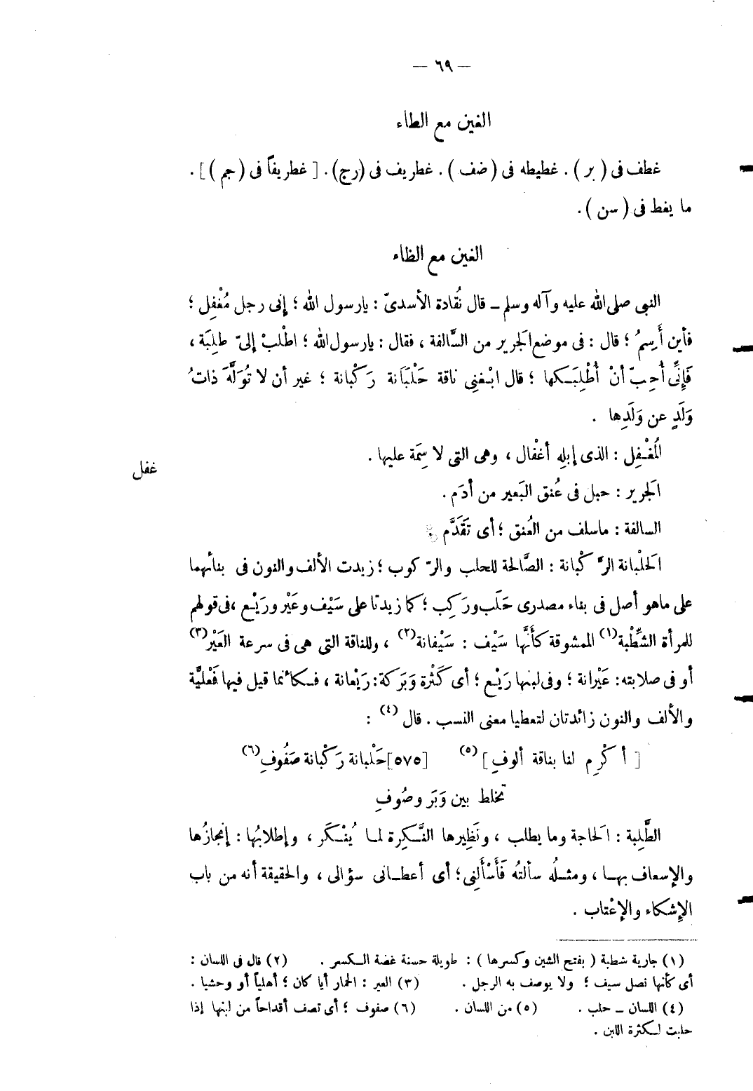 غفل النَّبِي صلى الله عَلَيْهِ وَسلم قَالَ نقادة الْأَسدي: يَا رَسُول الله إِنِّي رجل مُغفل فَأَيْنَ أسم قَالَ: فِي مَوضِع الْجَرِير من السالفة فَقَالَ: يَا رَسُول الله اطلب إِلَى طلبة فإ ني أحب أَن أطلبكها قَالَ ابغني نَاقَة حلبانة ركبانة غير أَن لَا توله ذَات ولد عَن وَلَدهَا. الْمُغَفَّل: الَّذِي إبِله أغفال وَهِي الَّتِي لَا سمة عَلَيْهَا. الْجَرِير: حَبل فِي عنق الْبَعِير من أَدَم. السالفة: مَا سلف من الْعُنُق أَي تقدم. الحلبانة الركبانة: الصا لحة للحلب والر كوب زيدت الْألف وَالنُّون فِي بنائهما على مَا هُوَ أصل فِي بِنَاء مصدري حلب وَركب كَمَا زيدتا على سيف وعير وريع فِي قَوْلهم للْمَرْأَة الشطبة الممشوقة كَأَنَّهَا سيف: سيفانة وللناقة الَّتِي هِيَ فِي سرعَة العير أَو فِي صلابته: عيرانة وَفِي لَبنهَا ريع أَي كَثْرَة وبركة: ريعانة فَكَأَنَّمَا قيل فِيهَا فعلية والأالف وَالنُّون زائدتان لتعطيا معنى النّسَب. قَالَ: ... [أكرِم لنا بِنَاقَة ألوفِ] ... حَلبانة رَكبانة صَفوفِ ... تخلط بَين وَبَر وصَوفِ الطّلبَة: الْحَاجة وَمَا يطْلب ونظيرها النكرَة لما يُنكر وإطلابها: إنجازها والإسعاف بهَا وَمثله سَأَلته فأسألني أَي أَعْطَانِي سُؤَالِي والحقيقة أَنه من بَاب الإشكاء والإعتاب.
