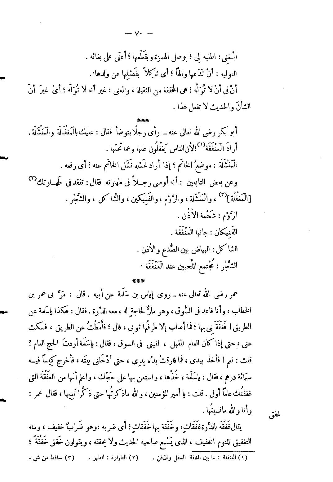 ابغني: اطلبه لي بوصل الْهمزَة بقطعها أَعنِي على بغائه. التَّوْلِيَة: أَن تدعها والهاً أَي ثاكلاً بفصلها عَن وَلَدهَا. أَن فِي أَن لَا تولَّه هِيَ المخففة من الثَّقِيلَة وَالْمعْنَى: غير أَنه لَا تولّه أَي غير أَن الشَّأْن والْحَدِيث لَا تفعل هَذَا. أَبُو بكر رَضِي الله تَعَالَى عَنهُ رأى رجلا يتَوَضَّأ فَقَالَ: عَلَيْك بالمغفلة والمنشلة. أَرَادَ العنفقة لِأَن النَّاس يغفلون عَنْهَا وَعَما تحتهَا. المنشلة: مَوضِع الْخَاتم إِذا أَرَادَ غسله نشل الْخَاتم عَنهُ أَي رَفعه. وَعَن بعض التَّابِعين: أَنه أوصى رجلا فِي طَهَارَته فَقَالَ: تفقد فِي طهارتك الممغفلة والمنشلة وَالروم والفنيكين والشاكل وَالشَّجر. الرَّوم شحمة الْأذن. الفنيكان: جانبا العنفقة. الشاكل: الْبيَاض بَين الصُّدع وَالْأُذن. الشّجر: مُجْتَمع اللحيين عِنْد العنفقة.