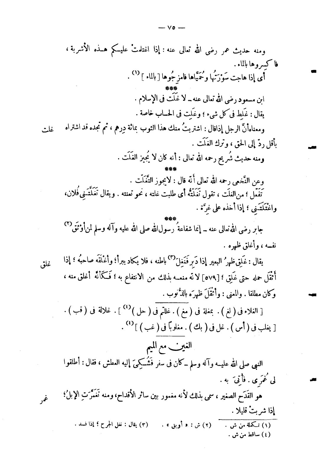 غلت ابْن مَسْعُود رَضِي الله تَعَالَى عَنهُ لَا غلت فِي الْإِسْلَام. يُقَال: غلط فِي كل شَيْء وغلت فِي الْحساب خَاصَّة. وَمَعْنَاهُ أَن الرجل إِذا قَالَ: اشْتريت مِنْك هَذَا الثَّوْب بِمِائَة دِرْهَم ثمَّ تَجدهُ قد اشْتَرَاهُ بِأَقَلّ ردّ إِلَى الْحق وَترك الغلت. وَمِنْه حَدِيث شُرَيْح رَحمَه الله تَعَالَى: أَنه كَانَ لَا يُجِيز الغلت. وَعَن النَّخعِيّ رَحمَه الله تَعَالَى أَنه قَالَ: لَا يجوز التَّغَلًت. تفّعل من الغلت تَقول تغلته أَي طلب غَلَّته نَحْو تعنته. وَيُقَال تغلتني فلاان واغتلتني إِذا أَخذه على غرَّة.