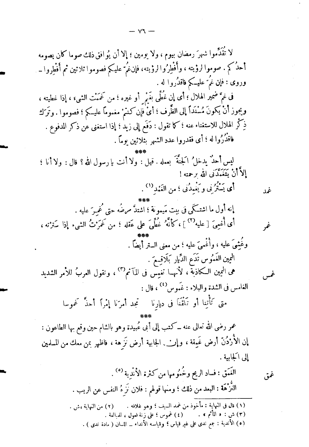 لَا تقدمُوا شهر رَمَضَان بِيَوْم وَلَا يَوْمَيْنِ إِلَّا أَن يُوَافق ذَلِك صوما كَانَ يَصُومهُ أحدكُم. صُومُوا لرُؤْيَته وأفطروا لرُؤْيَته فَإِن غُمّ عَلَيْكُم فصوموا ثَلَاثِينَ ثمَّ أفطروا وروى فَإِن غُمّ عَلَيْكُم فاقدروا لَهُ. فِي غمَّ ضمير الْهلَال أَي إِن غُطي بغيم أَو غَيره من غممت الشَّيْء إِذا غطيته وَيجوز أَن يكون مُسْندًا إِلَى الظّرْف أَي فَإِن كُنْتُم مغموما عَلَيْكُم فصوموا. وَترك ذكر الْهلَال للاستغناء عَنهُ كَمَا تَقول: دفع إِلَى زيد إِذا اسْتغنى عَن ذكر الْمَدْفُوع. فاقدروا لَهُ فقدروا عدد الشَّهْر بِثَلَاثِينَ يَوْمًا.