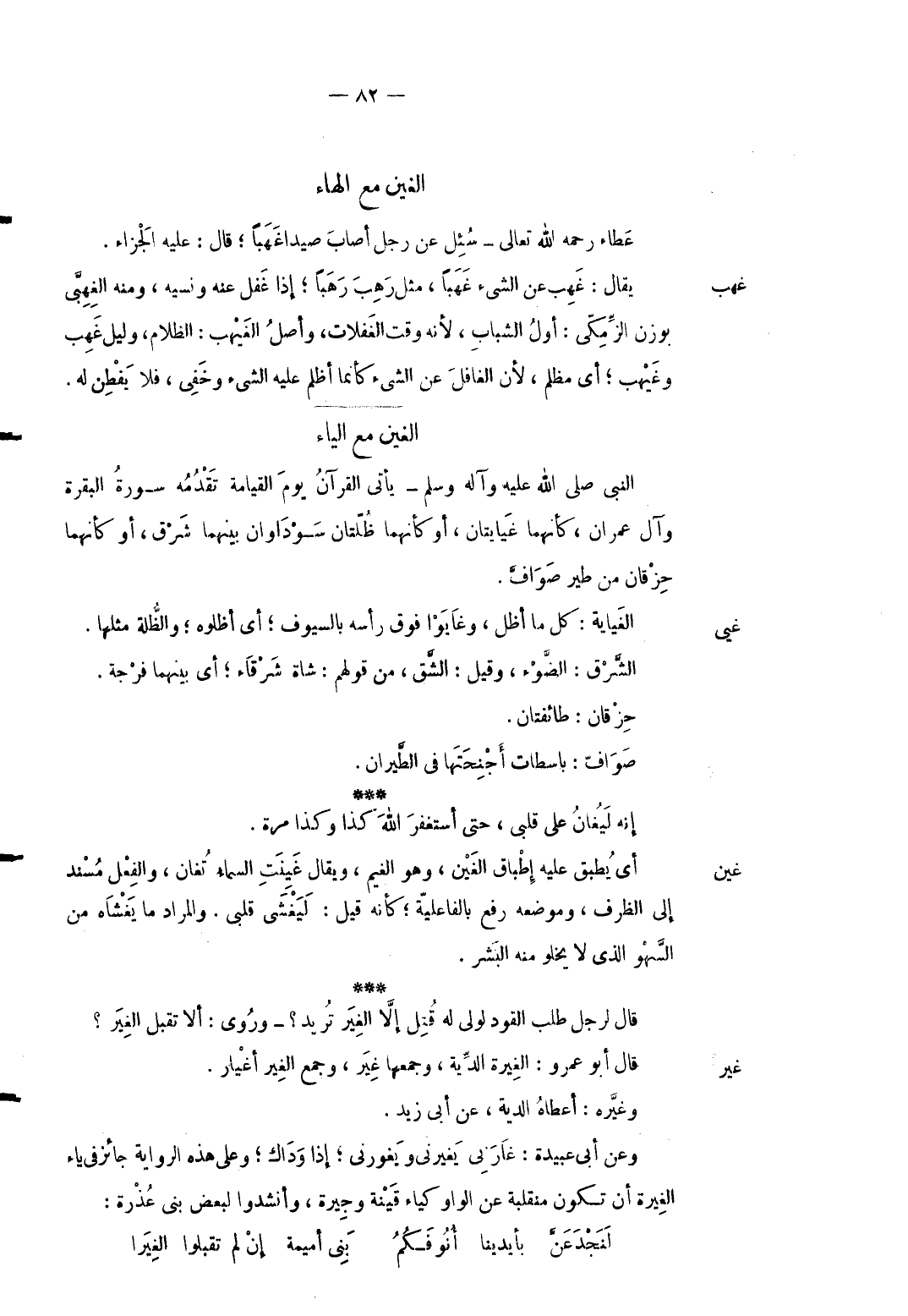 غين إِنَّه لغيان على قلبِي حَتَّى أسْتَغْفر الله كَذَا وَكَذَا مرّة. أَي يطبق عَلَيْهِ إطباق الْغَيْن وَهُوَ الْغَيْم وَيُقَال غينت السَّمَاء تغان وَالْفِعْل مُسْند إِلَى الظّرْف وموضعه رفع بالفاعلية كَأَنَّهُ قيل: ليغشى قلبِي. وَالْمرَاد مَا يَغْشَاهُ من السَّهْو إلذى لَا يَخْلُو مِنْهُ الْبشر.