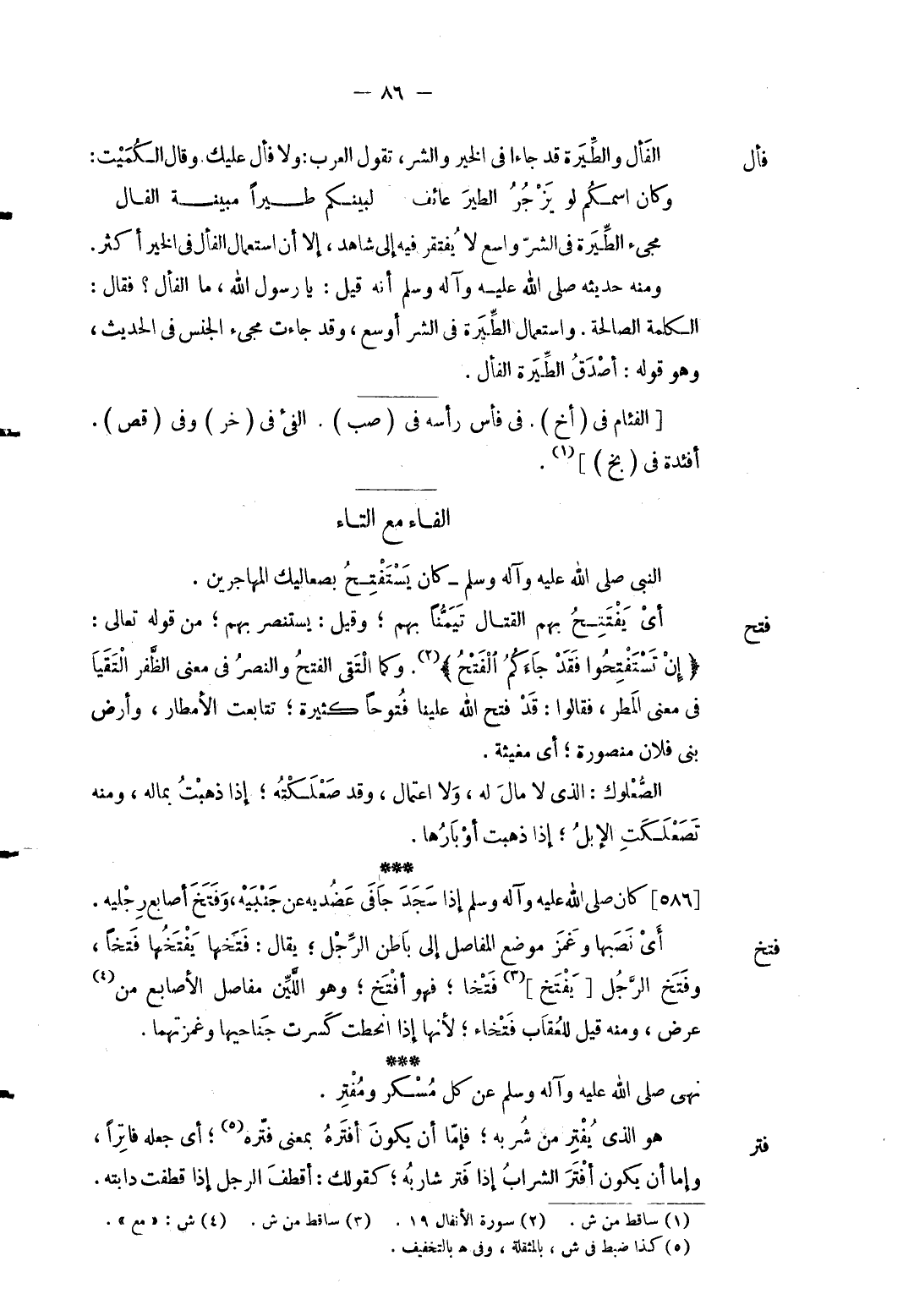 فتح النَّبِي صلى الله عَلَيْهِ وَسلم كَانَ يستفتح بصعاليك الْمُهَاجِرين. أَي يفْتَتح بهم الْقِتَال تيمناً بهم وَقيل: يستنصر بهم من قَوْله تَعَالَى: {إِنْ تَسْتَفْتِحُوا فَقَدْ جَاءِكُمُ الْفَتْحُ} وكما التقى الْفَتْح والنصر فِي معنى الظفر التقيا فِي معنى الْمَطَر فَقَالُوا: قد فتح الله علينا فتوحاً كَثِيرَة تَتَابَعَت الأمطار وَأَرْض بني فلَان منصورة أَي مغيثة. الصعلوك: الَّذِي لَا مَال لَهُ وَلَا اعتمال وَقد صعلكته إِذا ذهبت بِمَالِه وَمِنْه تصعلكت الْإِبِل إِذا ذهبت أوبارها.