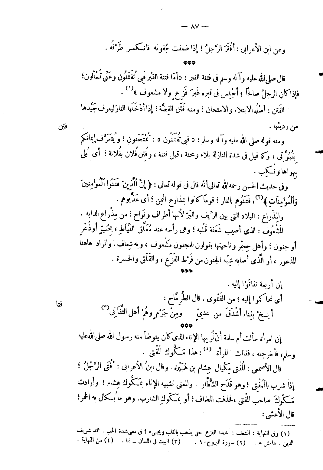 فتن قَالَ صلى الله عَلَيْهِ وَسلم فِي فتْنَة الْقَبْر: (أما فتْنَة الْقَبْر فَبِي تفتنون وعني تُسألون فَإِذا كَانَ الرجل صَالحا أَجْلِس فِي قَبره غير فزع وَلَا مشغوف) . الْفِتَن: أَصله الِابْتِلَاء والامتحان وَمِنْه فتن الْفضة إِذا أدخلها النَّار ليعرف جيِّدها من رديئها. وَمِنْه قَوْلهَا صلى الله عَلَيْهِ وَسلم: (فَبِي تفتنون) تمتحنون ويتعرف إيمَانكُمْ بنبوتي وكما قيل فِي شدَّة النَّازِلَة بلَاء ومحنة قيل فتْنَة وَفتن فلَان بفلانة أَي بلَى بهواها ونكب. وَفِي حَدِيث الْحسن رَحمَه الله تَعَالَى أَنه قَالَ فِي قَوْله تَعَالَى {إنَّ الَّذِينَ فَتَنُوا الْمُؤْمِنينَ وَالْمُؤْمِنَاتِ} فتنوهم بالنَّار قوما كَانُوا بمذارع الْيمن أَي عذبوهم. والمذراع: الْبِلَاد الَّتِي بَين الرِّيف وَالْبر لِأَنَّهَا أَطْرَاف ونواح من مذراع الدَّابَّة. المشعوف: الَّذِي أُصِيب شعفة قلبه وَهِي رَأسه عِنْد مُعَلّق النياط بحب أَو ذعر أَو جُنُون وَأهل حجر وناحيتها يَقُولُونَ للمجنون مشغوف وَبِه شغَاف وَالْمرَاد هَا هُنَا المذعور أَو الَّذِي أَصَابَهُ شبه الْجُنُون من فرط الْفَزع والقلق وَالْحَسْرَة.
