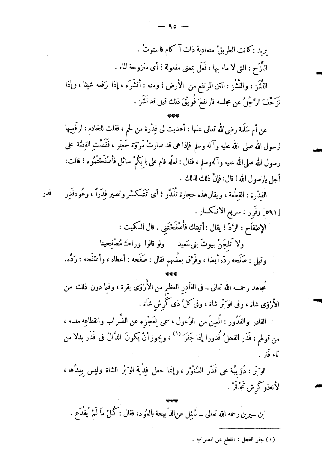 فدر عَن أم سَلمَة رَضِي الله تَعَالَى عَنْهَا: أهديت لي فدرة من لحم فَقلت للخادم: ارفعيها لرَسُول الله صلى الله عَلَيْهِ وَسلم فَإِذا هِيَ قد صَارَت مروة حجر فقصت الْقِصَّة على رَسُول الله صلى الله عَلَيْهِ وَسلم فَقَالَ: لَعَلَّه قَامَ على بَابَكُمْ سَائل فأصفحتموه قَالَت: أجل يَا رَسُول الله قَالَ: فَإِن ذَلِك لذَلِك. الفدرة: الْقطعَة وَيُقَال هَذِه حِجَارَة تفدر أَي تتكسر وَتصير فدراً وعود فدر وفزر: سريع الانكسار. الإصفاح: الردّ يُقَال: أَتَيْتُك قَالَ فأصفحتني. قَالَ الْكُمَيْت. ... وَلَا تَلِجَنْ بيوتَ بني سَعيد ... وَلَو قَالُوا وَرَاءَك مُصْفِحينا ... وَقيل: صفحه ردّه أَيْضا وفرَّق بَعضهم فَقَالَ: صفحه: أعطَاهُ وأصفحه: ردَّه. مُجَاهِد رَحمَه الله تَعَالَى فِي الفادر الْعَظِيم من الأروى بقرة وَفِيمَا دون ذَلِك من الأروى شَاة وَفِي الْوَبر شَاة وَفِي كل ذِي كرش شَاة. الفادر والفدور: المسن من الوعول سمي لعَجزه عَن الضراب وانقطاعه مِنْهُ من قَوْلهم: فدر الْفَحْل فدورا إِذا جفر وَيجوز أَن يكون الدَّال فِي فدر بَدَلا من تَاء فتر. الْوَبر: دويبة على قدر السنور وَإِنَّمَا جعل فديَة الْوَبر الشَّاة وَلَيْسَ بندِّها لِأَنَّهُ ذُو كرش تجتر.