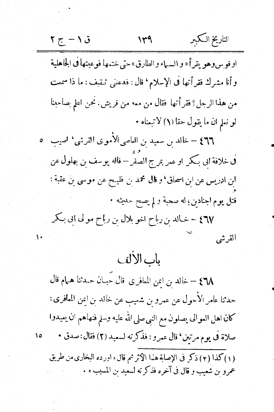 (1) هكذا في الاصل ويوافقه ما في كتاب ابن ابى حاتم فانه قال في ترجمة خالد هذا " روى عَنِ الشَّعْبِيّ روى عَنْهُ مروان بْن مُعَاوِيَة " اما ابن حبان فقال " روى عنه عبد الله بن حبيب " فكأنه كان في نسخته من تاريخ البخاري " عن