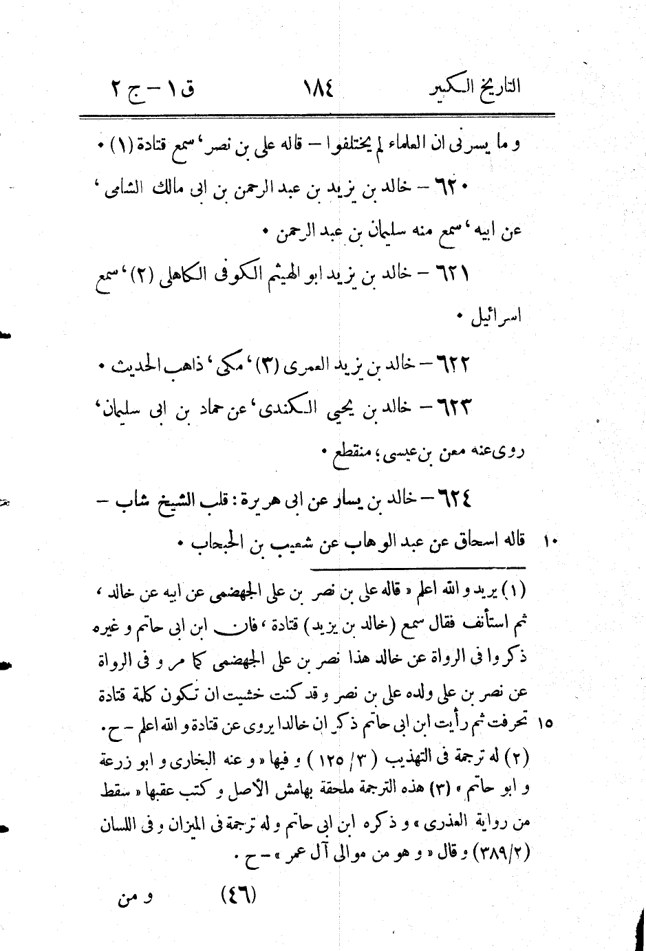 (1) زدناه وفاء بالعادة - ح (2) قال ابن ابى حاتم " خالد بن يزيد المكى روى عن مجاهد في قوله عزوجل " لا يأتية الباطل من بين يديه " روى عنه ابن جريج سمعت ابى يقول ذلك " - ح (3) كذا في الاصل وأخشى ان يكون الصواب " ابنه محمد " فان ابن ابى حاتم ذكر نحو هذه الترجمة وقال " ابنه محمد " وكذلك ابن حبان وقد تقدم في المحمدين (1 / 1 / 73) " مُحَمَّدُ بْنُ خَالِد عَنْ أَبِيهِ عَنْ جَدِّهِ.." وسماه في التهذيب (3 / 132) خالد السلمى، وفى لسان الميزان خالد بن ابى خالد وذكر انه قيل في اسم ابيه زيد بن جارية، وقيل اللجلاج بن حكيم والله اعلم - ح (4) في التهذيب في ترجمة = [*]