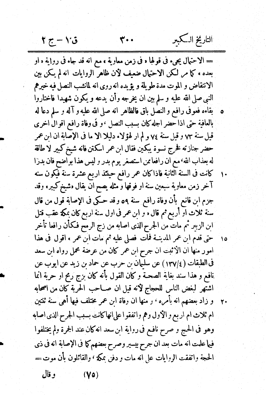 73 - وتصريحه كغيره ان ابن عمر مات بالجرح الذى اصابه في حجته فانه ان كان موت ابن عمر سنة ثلاث يكون بينهما سبعة اشهر وإن كان في سنة اربع يكون بينهما سنة وسبعة اشهر، وبالجملة فما جزم به المؤلف ان وفاة رافع كانت في زمن معاوية هو الراجح ويؤكده انه لم يسمع لرافع بعد معاوية بخبر ولم يرو عنه من يعلم انه لم يدرك زمن معاوية وقدر لجحه في الاصابة قال " واما البخاري فقال مات في زمن معاوية وهو المعتمد وما عداه واه " والله اعلم - ح.