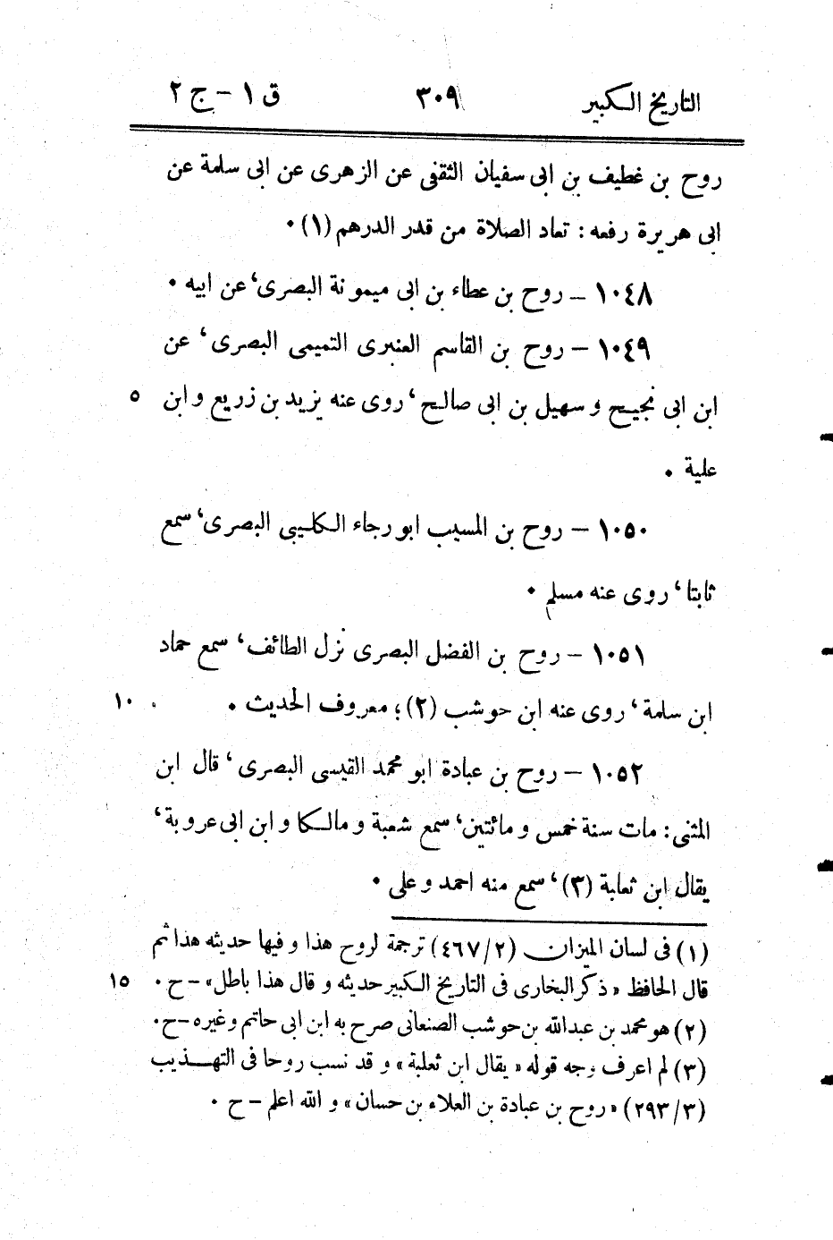" وفى الاخر " روح اراه بصريا.." وقال ابن ابى حاتم " روح البصري.." ولم يذكره ابن حبان ولكن ذكر في ترجمة روح بن القاسم المتقدم رقم (1049) انه روى عنه ابن المبارك ولم يذكر ذلك غيره حتى المزى مع محاولته الاستيعاب فكان ابن حبان يزعم ان روحا هذا هو ابن القاسم وقد دل صنيع ابن ابى حاتم وابن حبان انه لم يكن في نسختيهما من هذا الكتاب " روح بن بشر " ويؤيده انه لو كان كذلك لكان ظاهر السياق إما ان روحا روى عن عبد الله وهو ابن المبارك.