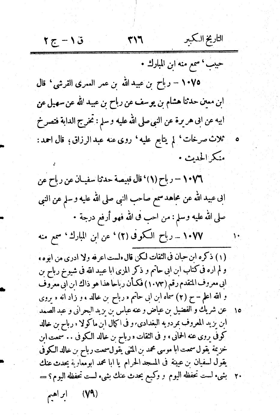 (1) سيأتي في السند " عَنْ رباح بْن بشر أو بشير بْن محرز " وهذا يحتمل وجهين الاول ان يكون الشك في اسم الاب فقط هذا الرجل " رباح بن بشر بن محرز أو " رباح بن بشير بن محرز " الثاني ان يكون الشك في الراوى نفسه أرباح ابن بشر هو أم بشير بن محرز، والاول هو الظاهر وقد مشى على ذلك ابن ماكولا فقال: رباح بن بشر بن محرز..قال البخاري قال لى بشر بن مرحوم.." ومشى عليه ابن ابى حاتم وابن حبان ولكن وقع في النسخ تخليط ففى نسخة كتاب ابن ابى حاتم " رباح بن بشير أبو بشر " وفى الثقات " رباح بن بشير وقيل بشير " والله اعلم - ح (2) قد تقدم في باب بشير (1 / 2 / 102) ترجمة لبشير بن محرز ولا يبعد ان يكون هو والد رباح هذا والله اعلم - ح.