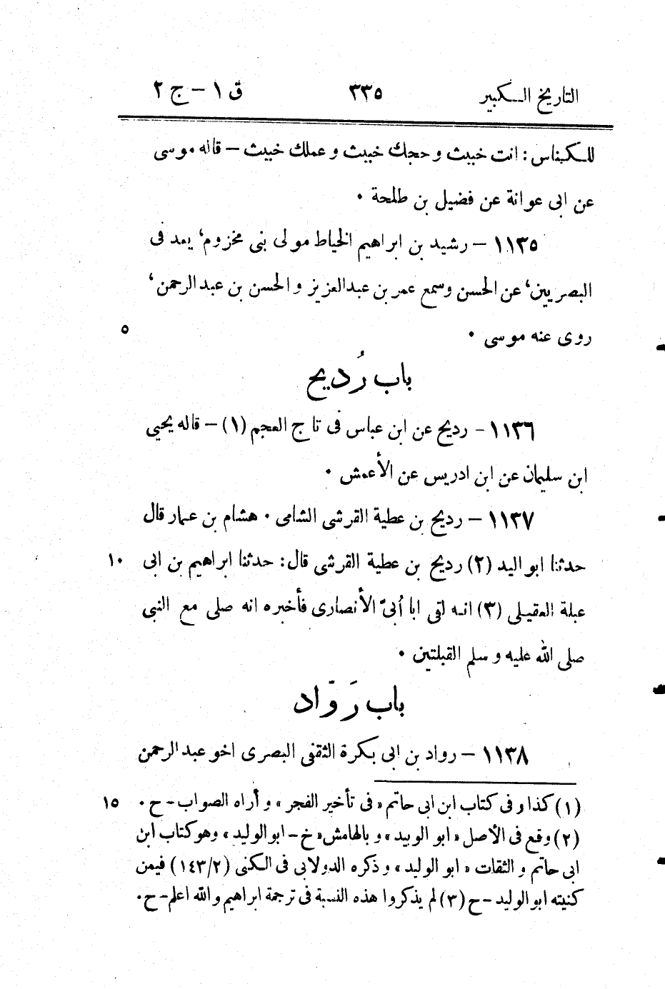 (1) سيأتي في الافراد من باب الواو (4 / 2 / 186) " وارد (وفى نسخة ودة) أبو عاصم العسقلاني " وأراه روادا هذا وقد علقت عليه هناك فراجعه - ح (2) وقع في الاصل " رجال " بالجيم وكذلك في الاسمين الاتيين وكتب بالهامش " ذكر هما عبد الغنى في باب رحال بالحاء غير معجمة " اقول وكذا ابن ماكولا وقال بعد ذكر كل من الرجلين " قاله البخاري " وهذا يدل ان الثابت في اصل التاريخ بالحاء المهملة والخطأ من النساخ والله اعلم - ح (3) وقع في الاصل " الفريعى " وبالهامش! " القريعى بالقاف صوابه " اقول وهو المعروف ووقع في ثقات ابن حبان " رحال بن مسلم (كذا) روى عن عطاء روى عنه عتاب بن عبد العزيز " فكأنه جعل هذا والذى بعده واحدا والله اعلم.