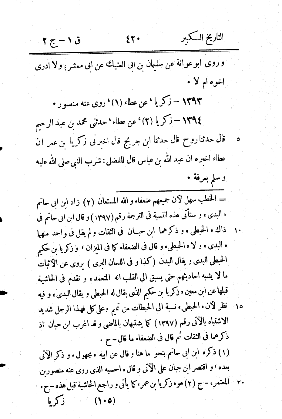 (1) زاد ابن ابى حاتم " المؤذن " (2) هكذا في كتاب ابن ابى حاتم وغيره وسيأتى في ترجمة يحيى بن زكريا بن ابى زائدة (4 / 2 / 273) " سمع اباه " ووقع في الاصل " وابوه " وهو سبق قلم من الناسخ - ح (3) هكذا ضبطه في الاصل وعليه " صح " وهكذا ضبطه ابن السمعاني في الانساب الورقة 69 الوجه الثاني ونحوه في لب اللباب للسيوطي، ولم يصرح ابن ماكولا ولا الذهبي في المشتبه باهمال الدال وظاهر سياقهما يقتضى اهمالها وخالف في ذلك ابن حجر في التبصير قال " وذال معجمة مثقلة " وقال في اللسان (2 / 479) " وقال ابن حبان زكريا بن حكيم الحبطى البدى ويقال البرى " ثم ضبط ذلك ص 483 قال " البدى والبرى بالموحده الضممومة فيهما وتشديد الراء والدال " وقد صرح ابن السمعاني ثم السيوطي بأن الموحدة مفتوحة، هذا وأما ابن ابى حاتم فقال في هذا " الحبطى " وكذلك في تاريخ بغداد (8 / 451) وذكره ابن حبان في الثقات ولم يقل " البدى " ولا " الحبطى " وقال في الضعفاء ما تقدم راجع ما علقناه على رقم (1391) ورقم (1392) والله اعلم - ح.