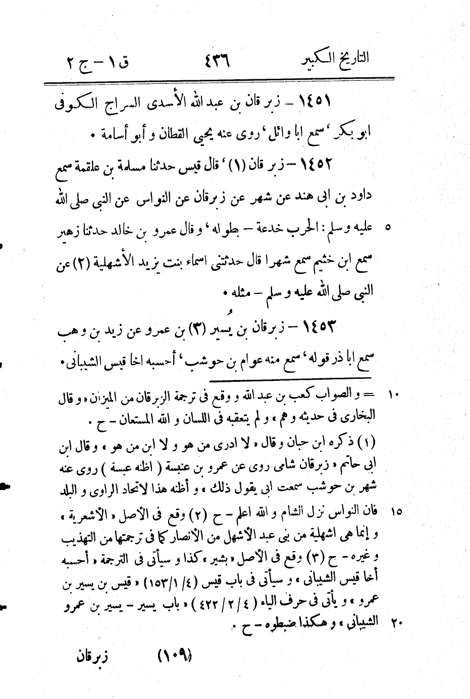 1454 - زبرقان، قَالَ حبان حدثنا شريك بْن الْخَطَّاب قَالَ حدثني الزبرقان بْن الحارث النميري (1) : قلت للأحنف بْن قيس فِي مسجد الكوفة يا أبا بحر.