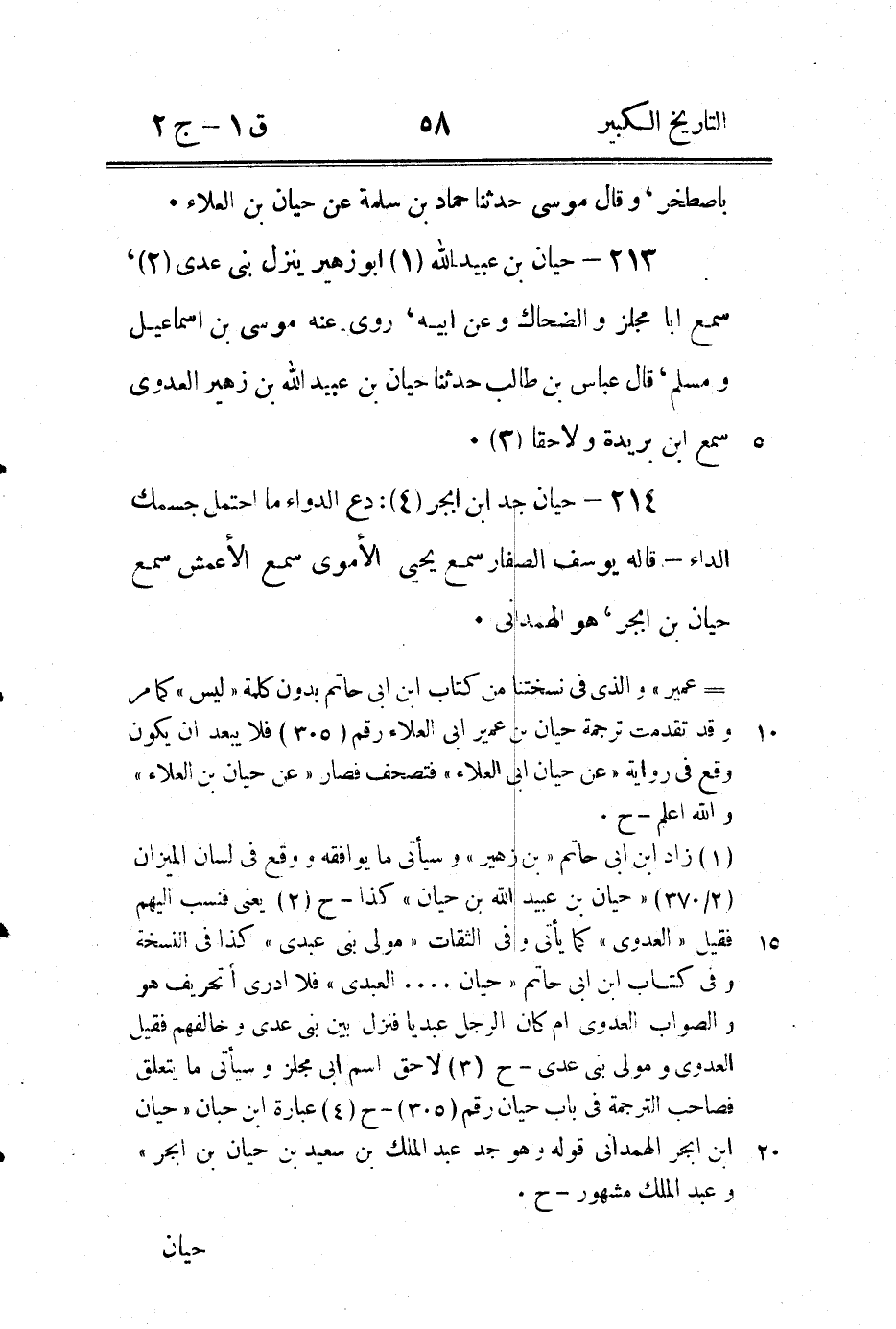 (1) في الثقات " حيان بن جبلة يروى عن عبيد الله بن العيزار روى عنه اهل العراق " وقال ابن ابى حاتم " حيان بن عبد الله بن حيان أبو جبلة المازنى روى عن حميد وهشام بن عروة وعبيد الله والعيزار وقتادة روى عنه أبو الوليد الطيالسي وإبراهيم بن موسى ومحمد بن بشار وأبو حفص الصيرفى ومحمد بن المثنى..وروى عن الجريرى روى عنه زيد بن الحباب " وذكر ابن ابى حاتم في هذا الباب " حيان بن ابى جبلة.." وإنما هو حبان بالكسر والموحدة سيأتي وأعاده ابن ابى حاتم في بابه ايضا - ح (2) كذا (3) كذا