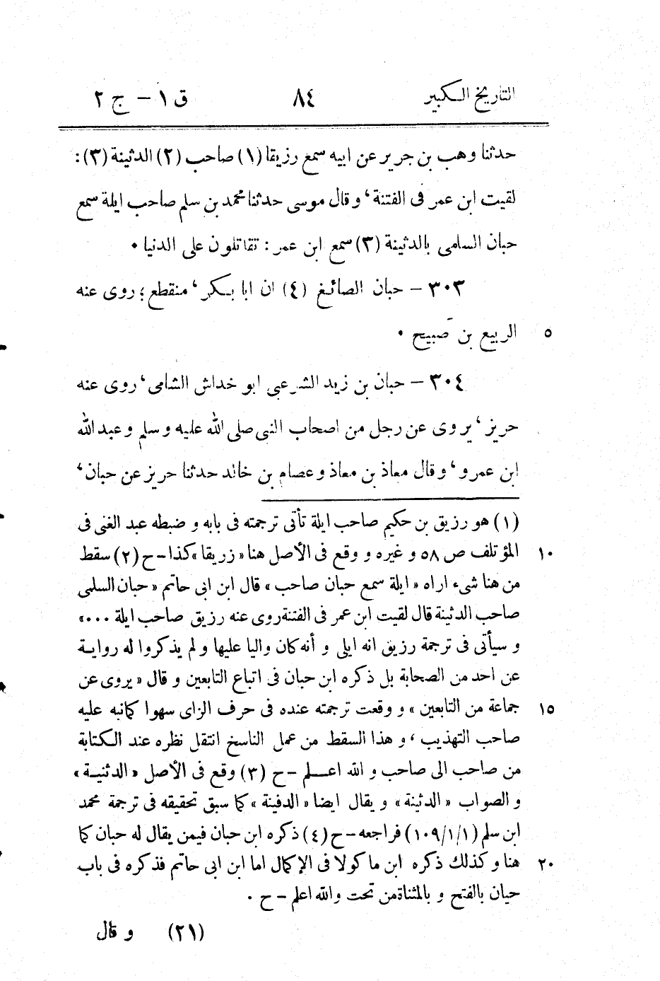 عنده " حبان " بالكسر والموحدة - ح (2) هذه العبارة والعبارة الاتية " وقال الصلت ... " وقوله آخر الترجمة " وقال وهب بن جرير.." إلى آخر الترجمة فيها شئ فقد تقدم في باب حيان بالمثناة من تحت رقم (213) " حيان ابن عبيد الله أبو زهير "..وقدمنا ان ابن ابى حاتم قال فيه " حبان بن عبيد الله ابن زهير أبو زهير " وقد ذكره ابن حبان في الثقات بنحو ما تقدم، وفى الكنى للدولابي (1 / 183) " أبو زهير حيان بن زهير العدوى يحدث عنه وهب بن جرير " وقال الذهبي في الميزان " حيان بن عبيد الله أبو زهير شيخ بصرى عن ابى مجلز قال البخاري ذكر منه الصلت الاختلاط روى عنه مسلم وموسى التبوذكى وقال ابراهيم بن الحجاج السامى ثنا حيان بن عبيد الله أبو زهير العدوى ثنا أبو مجلز عن ابن عباس وثنا ابن بريدة عن ابيه ... " اقول وهذا يوافق ما تقدم في رقم (213) الا في قوله " ذكر منه الصلت الاختلاط " فانما ذكره المؤلف هنا، وإلا قوله " وقال ابراهيم بن الحجاج السامى " فانه بدله في رقم (213) " قال عباس بن طالب " والباقى متفق في المعنى، وفى الميزان فيمن اسمه حبان بالكسر والموحدة " حبان بن يسار الكلابي البصري أبو رويحة ويقال أبو روح عن ثابت البنانى وبريد بن ابى مريم..ذكره ابن حبان في الثقات والبخاري في الضعفاء فأشار إلى انه تغير " وذكر قبله " حبان بالكسر هو ابن زهير ويقال ابن يسار أبو روح قال ابن حبان = [*]