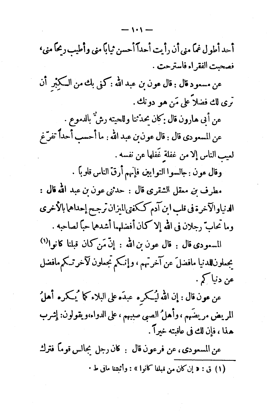 عن مسعود قال قال عون بن عبدالله كفى بك من الكبر أن ترى لك فضلا على من هو دونك