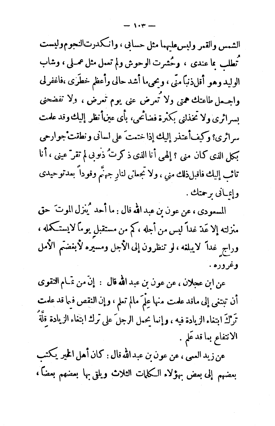 الشمس والقمر وليس عليهما مثل حسابي وانكدرت النجوم وليست تطلب بما عندي وحشرت الوحوش ولم تعمل مثل عملي وشاب الوليد وهو أقل ذنبا مني ويحي ما أشد حالي وأعظم خطري فاغفر لي واجعل طاعتك همتي ولا تعرض عني يوم تعرض ولا تفضحني بسرائري ولا تخذلني بكثرة فضائحي بأي عين أنظر إليك وقد علمت سرائري وكيف أعتذر إليك إذا ختمت على لساني ونطقت جوارحي بكل الذي كان منى إلهي أنا الذي ذكرت ذنوبي لم تقر عيني أنا تائب إليك فاقبل ذلك مني ولا تجعلني لنار جهنم وقودا بعد توحيدي وإيماني برحمتك